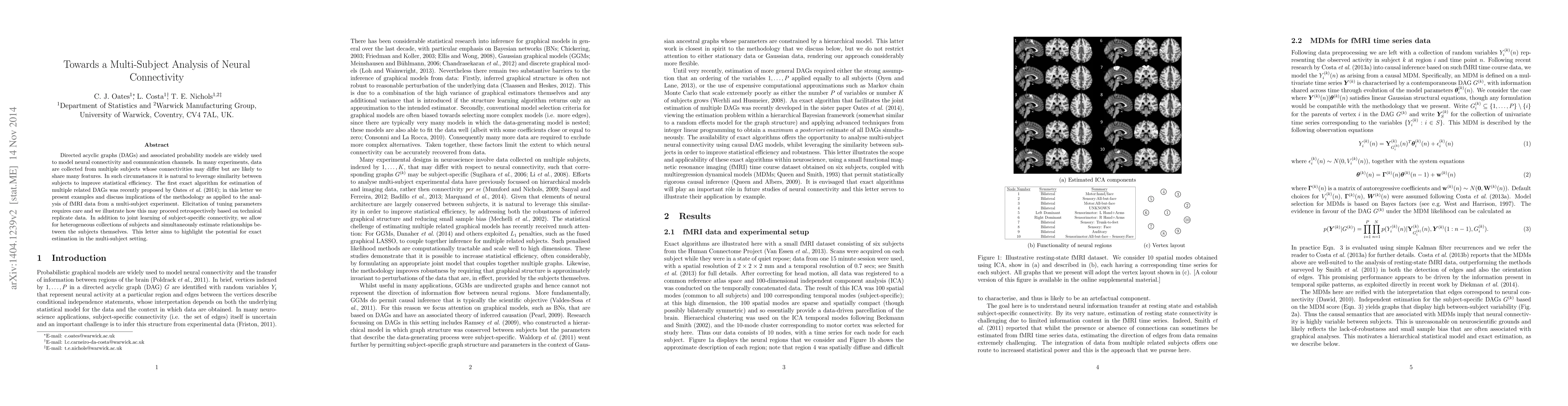Directed acyclic graphs (DAGs) and associated probability models are widely used to model neural connectivity and communication channels. In many experiments, data are collected from multiple subjects whose connectivities may differ but are likely to share many features. In such circumstances it is natural to leverage similarity between subjects to improve statistical efficiency. The first exact algorithm for estimation of multiple related DAGs was recently proposed by Oates et al. 2014; in this letter we present examples and discuss implications of the methodology as applied to the analysis of fMRI data from a multi-subject experiment. Elicitation of tuning parameters requires care and we illustrate how this may proceed retrospectively based on technical replicate data. In addition to joint learning of subject-specific connectivity, we allow for heterogeneous collections of subjects and simultaneously estimate relationships between the subjects themselves. This letter aims to highlight the potential for exact estimation in the multi-subject setting.