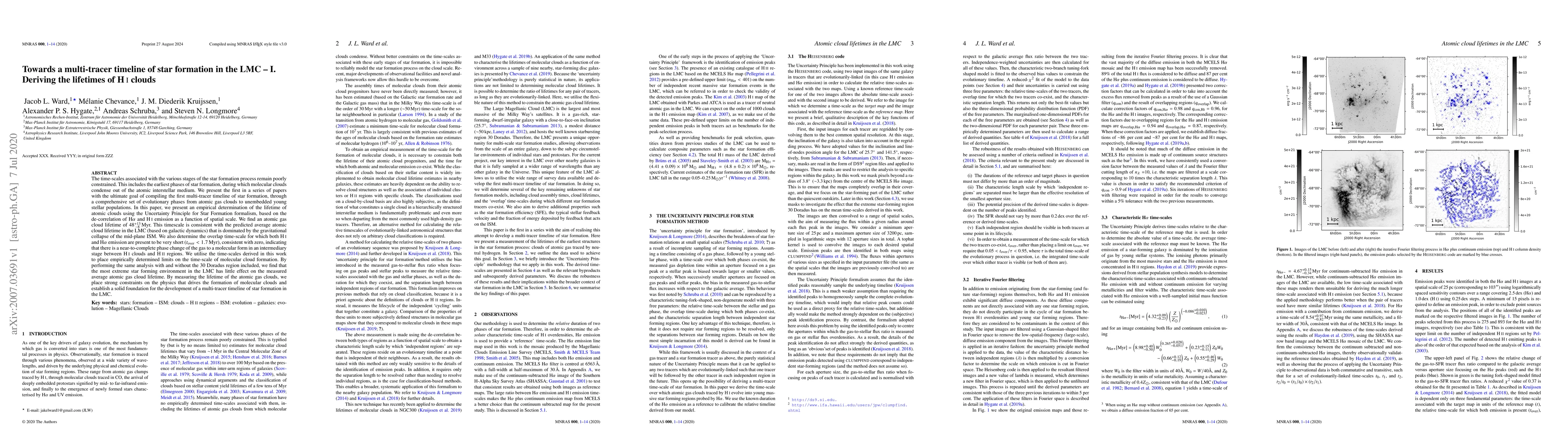 This paper determines the lifetime of atomic gas clouds in the Large Magellanic Cloud (LMC) to be 48 Myr, using the Uncertainty Principle for Star Formation. The study finds a short overlap time of less than 1.7 Myr between H\,{\sc i} and H$\alpha$ emissions, indicating a rapid transition to molecular clouds. The findings provide a foundation for developing a multi-tracer timeline of star formation in the LMC.