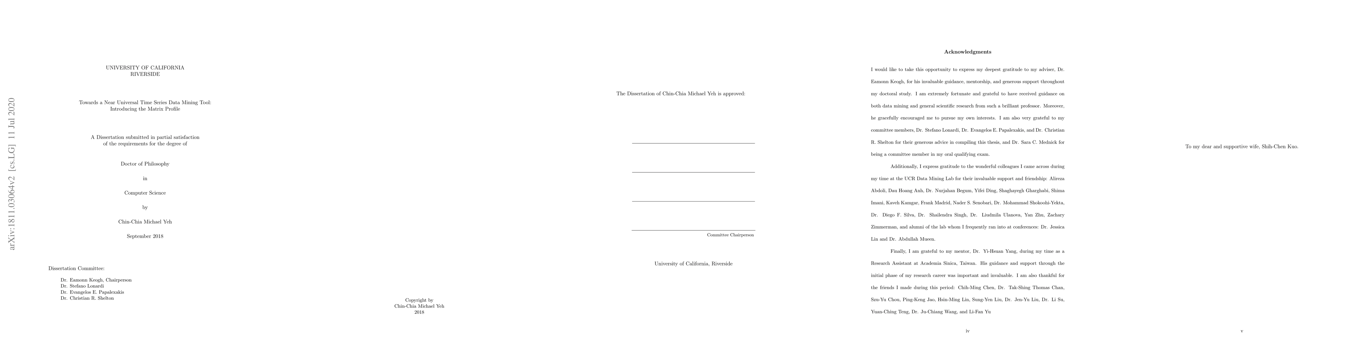 The last decade has seen a flurry of research on all-pairs-similarity-search (or, self-join) for text, DNA, and a handful of other datatypes, and these systems have been applied to many diverse data mining problems. Surprisingly, however, little progress has been made on addressing this problem for time series subsequences. In this thesis, we have introduced a near universal time series data mining tool called matrix profile which solves the all-pairs-similarity-search problem and caches the output in an easy-to-access fashion. The proposed algorithm is not only parameter-free, exact and scalable, but also applicable for both single and multidimensional time series. By building time series data mining methods on top of matrix profile, many time series data mining tasks (e.g., motif discovery, discord discovery, shapelet discovery, semantic segmentation, and clustering) can be efficiently solved. Because the same matrix profile can be shared by a diverse set of time series data mining methods, matrix profile is versatile and computed-once-use-many-times data structure. We demonstrate the utility of matrix profile for many time series data mining problems, including motif discovery, discord discovery, weakly labeled time series classification, and representation learning on domains as diverse as seismology, entomology, music processing, bioinformatics, human activity monitoring, electrical power-demand monitoring, and medicine. We hope the matrix profile is not the end but the beginning of many more time series data mining projects.