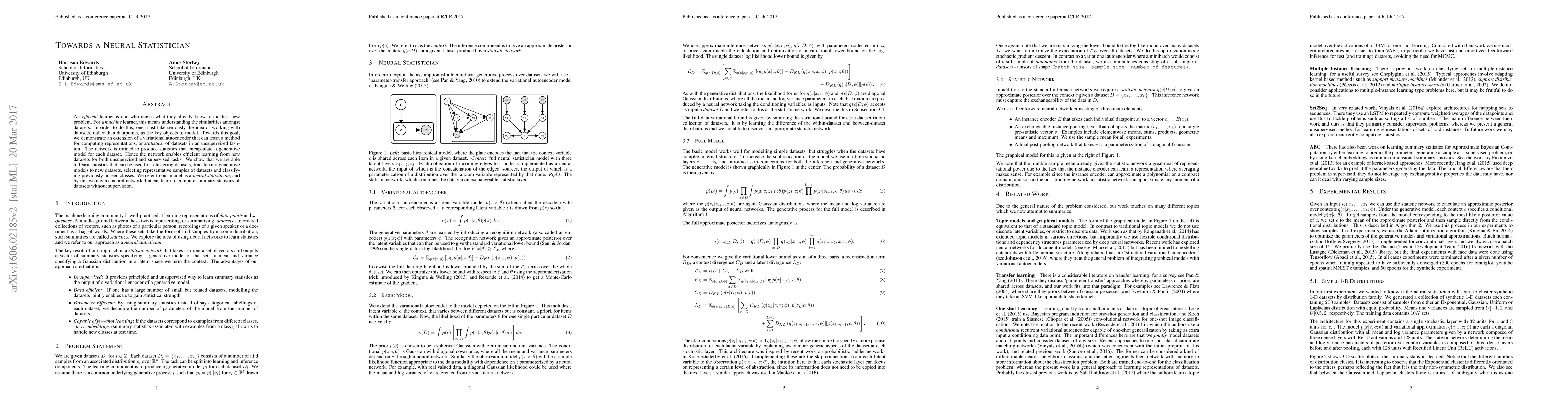 The paper proposes a neural statistician model, an extension of a variational autoencoder, that learns to compute statistics of datasets in an unsupervised manner. The network is trained to produce statistics encapsulating a generative model for each dataset, enabling efficient learning from new datasets for both unsupervised and supervised tasks.