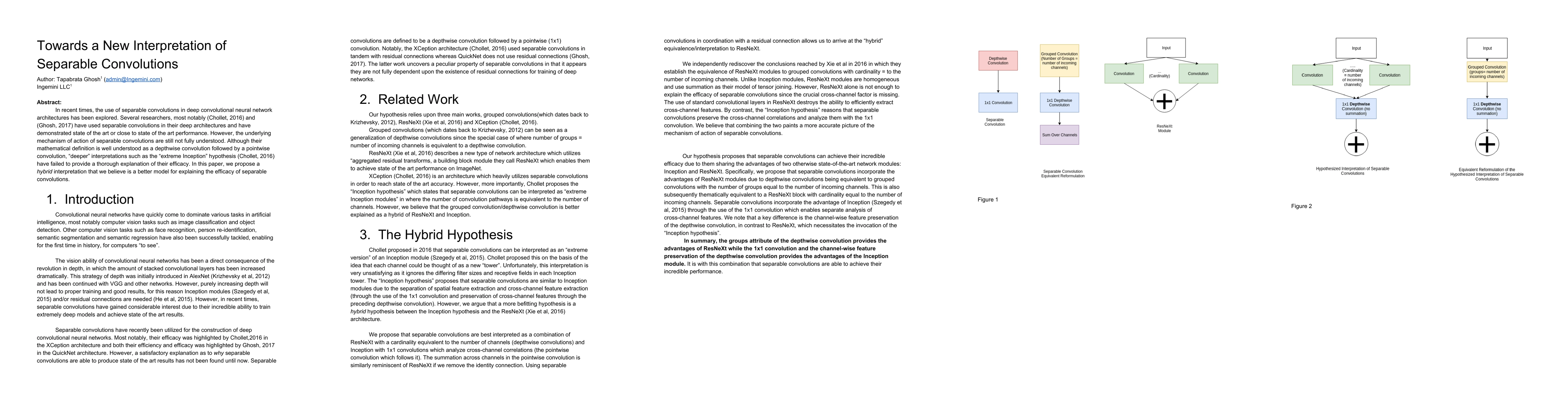 This paper proposes a new hybrid interpretation of separable convolutions, aiming to better explain their efficacy in deep convolutional neural networks, beyond the conventional mathematical understanding of depthwise and pointwise convolutions. Previous hypotheses, such as the extreme Inception hypothesis, have not fully captured their performance benefits.