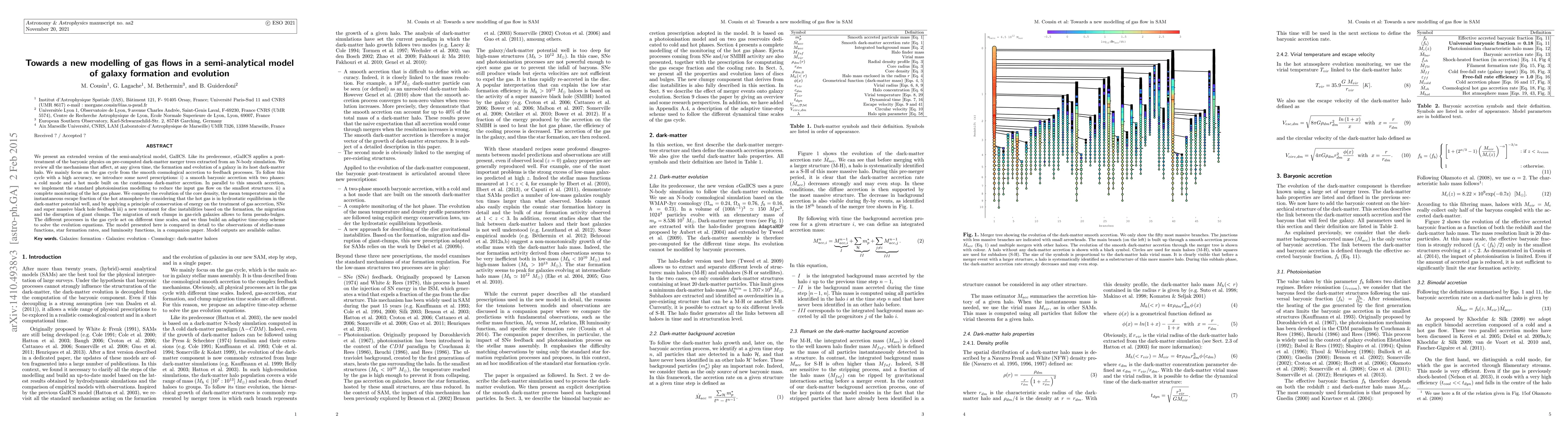 This paper presents an extended version of the semi-analytical model GalICS, focusing on novel prescriptions for gas flow modelling in galaxy formation and evolution. It introduces a smooth baryonic accretion model with cold and hot modes, monitors the hot gas phase, and treats disc instabilities with giant clumps, employing an adaptive time-step scheme for accuracy.