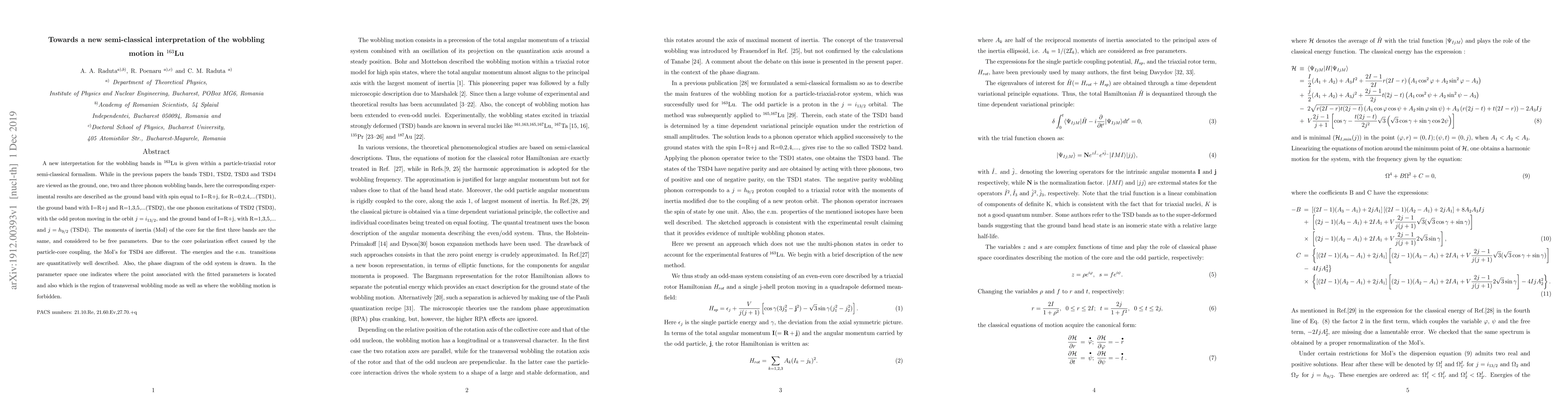 A new interpretation for the wobbling bands in $^{163}$Lu is given within a particle-triaxial rotor semi-classical formalism. While in the previous papers the bands TSD1, TSD2, TSD3 and TSD4 are viewed as the ground, one, two and three phonon wobbling bands, here the corresponding experimental results are described as the ground band with spin equal to I=R+j, for R=0,2,4,...(TSD1), the ground band with I=R+j and R=1,3,5,...(TSD2), the one phonon excitations of TSD2 (TSD3), with the odd proton moving in the orbit $j=i_{13/2}$, and the ground band of I=R+j, with R=1,3,5,... and $j=h_{9/2}$ (TSD4). The moments of inertia (MoI) of the core for the first three bands are the same, and considered to be free parameters. Due to the core polarization effect caused by the particle-core coupling, the MoI's for TSD4 are different. The energies and the e.m. transitions are quantitatively well described. Also, the phase diagram of the odd system is drawn. In the parameter space one indicates where the point associated with the fitted parameters is located and also which is the region of transversal wobbling mode as well as where the wobbling motion is forbidden.