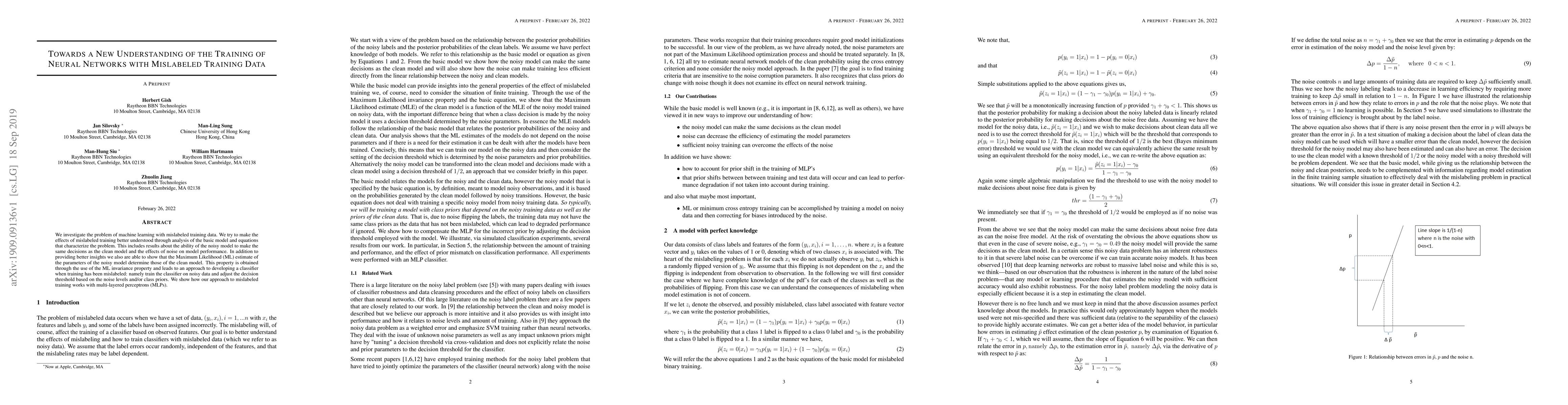We investigate the problem of machine learning with mislabeled training data. We try to make the effects of mislabeled training better understood through analysis of the basic model and equations that characterize the problem. This includes results about the ability of the noisy model to make the same decisions as the clean model and the effects of noise on model performance. In addition to providing better insights we also are able to show that the Maximum Likelihood (ML) estimate of the parameters of the noisy model determine those of the clean model. This property is obtained through the use of the ML invariance property and leads to an approach to developing a classifier when training has been mislabeled: namely train the classifier on noisy data and adjust the decision threshold based on the noise levels and/or class priors. We show how our approach to mislabeled training works with multi-layered perceptrons (MLPs).
