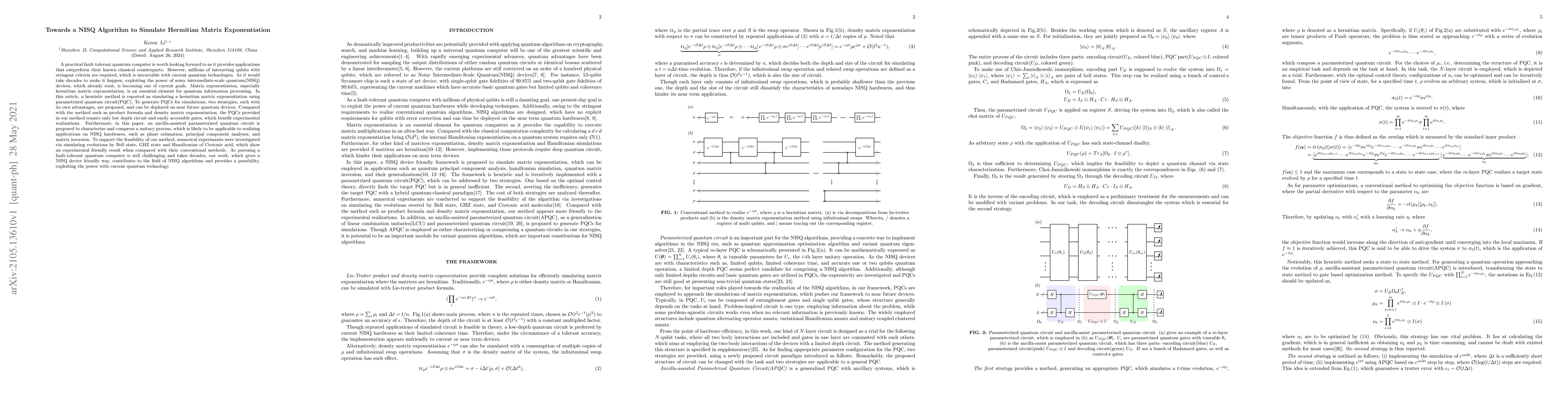 Researchers propose a novel method for simulating Hermitian matrix exponentiation using parametrized quantum circuits that can be implemented on near-future NISQ devices, offering a potential solution for fault-tolerant quantum computing.