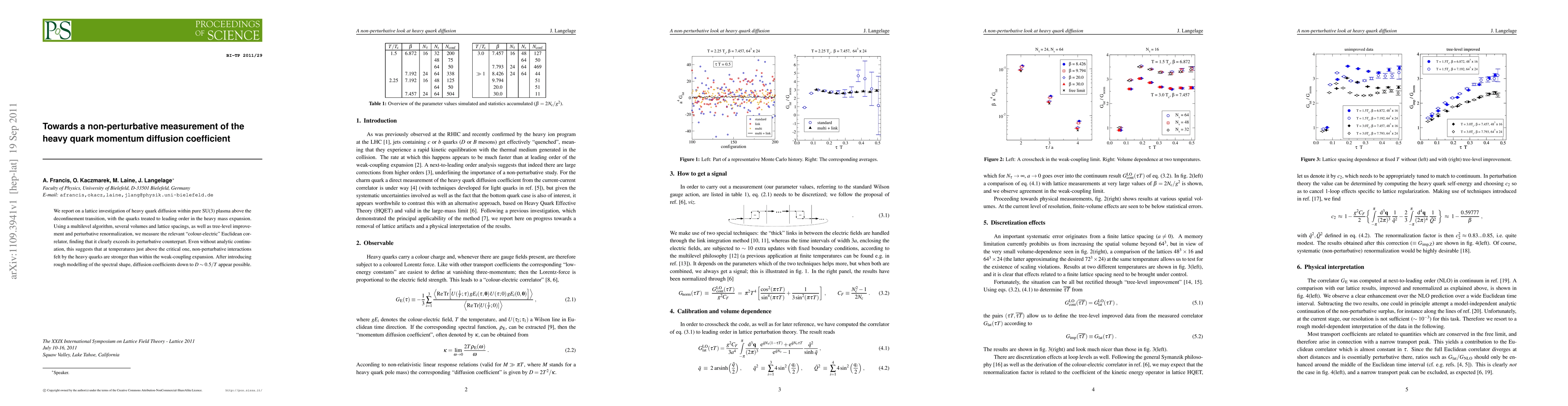 Researchers investigated heavy quark diffusion in a plasma above deconfinement, finding that non-perturbative interactions with heavy quarks are stronger than predicted by weak-coupling expansion, suggesting diffusion coefficients as low as 0.5/T.