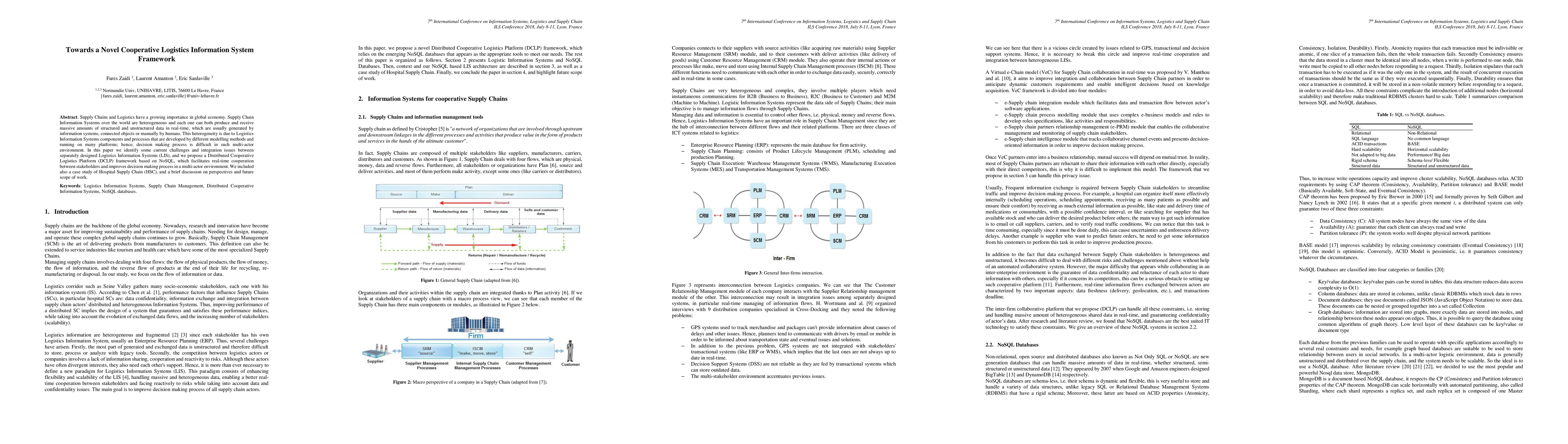 Supply Chains and Logistics have a growing importance in global economy. Supply Chain Information Systems over the world are heterogeneous and each one can both produce and receive massive amounts of structured and unstructured data in real-time, which are usually generated by information systems, connected objects or manually by humans. This heterogeneity is due to Logistics Information Systems components and processes that are developed by different modelling methods and running on many platforms; hence, decision making process is difficult in such multi-actor environment. In this paper we identify some current challenges and integration issues between separately designed Logistics Information Systems (LIS), and we propose a Distributed Cooperative Logistics Platform (DCLP) framework based on NoSQL, which facilitates real-time cooperation between stakeholders and improves decision making process in a multi-actor environment. We included also a case study of Hospital Supply Chain (HSC), and a brief discussion on perspectives and future scope of work.