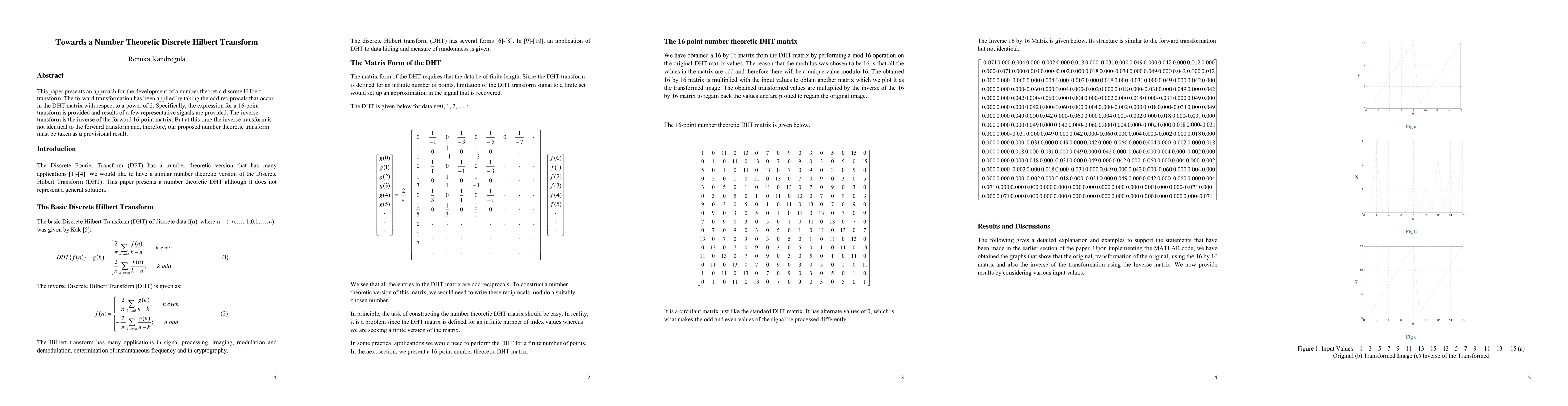 This paper introduces a number theoretic discrete Hilbert transform using odd reciprocals in the DHT matrix for power-of-2 points, providing a 16-point transform and representative signal results. The inverse transform is not yet identical to the forward transform, marking the proposed method as provisional.