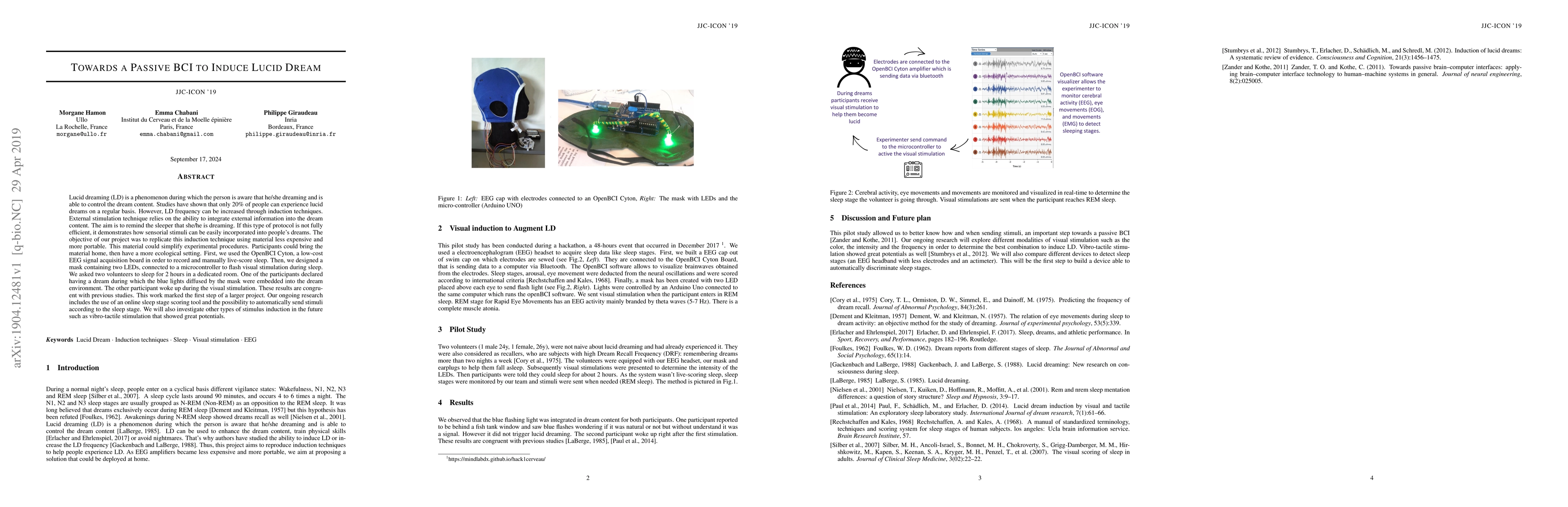 Lucid dreaming (LD) is a phenomenon during which the person is aware that he/she dreaming and is able to control the dream content. Studies have shown that only 20% of people can experience lucid dreams on a regular basis. However, LD frequency can be increased through induction techniques. External stimulation technique relies on the ability to integrate external information into the dream content. The aim is to remind the sleeper that she/he is dreaming. If this type of protocol is not fully efficient, it demonstrates how sensorial stimuli can be easily incorporated into people's dreams. The objective of our project was to replicate this induction technique using material less expensive and more portable. This material could simplify experimental procedures. Participants could bring the material home, then have a more ecological setting. First, we used the OpenBCI Cyton, a low-cost EEG signal acquisition board in order to record and manually live-score sleep. Then, we designed a mask containing two LEDs, connected to a microcontroller to flash visual stimulation during sleep. We asked two volunteers to sleep for 2 hours in a dedicated room. One of the participants declared having a dream during which the blue lights diffused by the mask were embedded into the dream environment. The other participant woke up during the visual stimulation. These results are congruent with previous studies. This work marked the first step of a larger project. Our ongoing research includes the use of an online sleep stage scoring tool and the possibility to automatically send stimuli according to the sleep stage. We will also investigate other types of stimulus induction in the future such as vibro-tactile stimulation that showed great potentials.