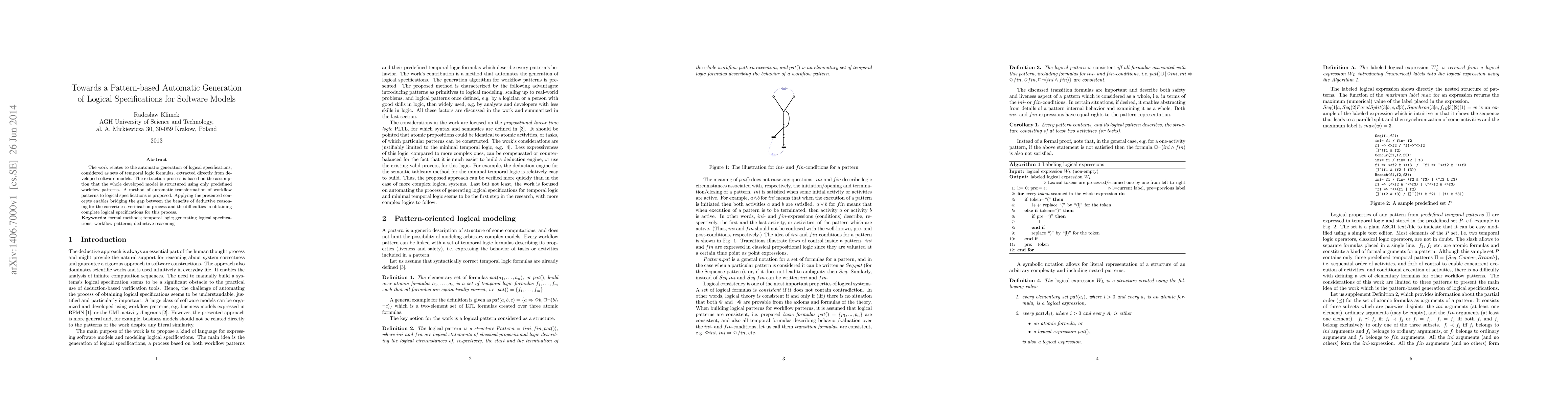 This paper proposes a method for automatically generating logical specifications from software models structured using predefined workflow patterns, aiming to bridge the gap between deductive reasoning benefits and the challenge of obtaining complete logical specifications for correctness verification.