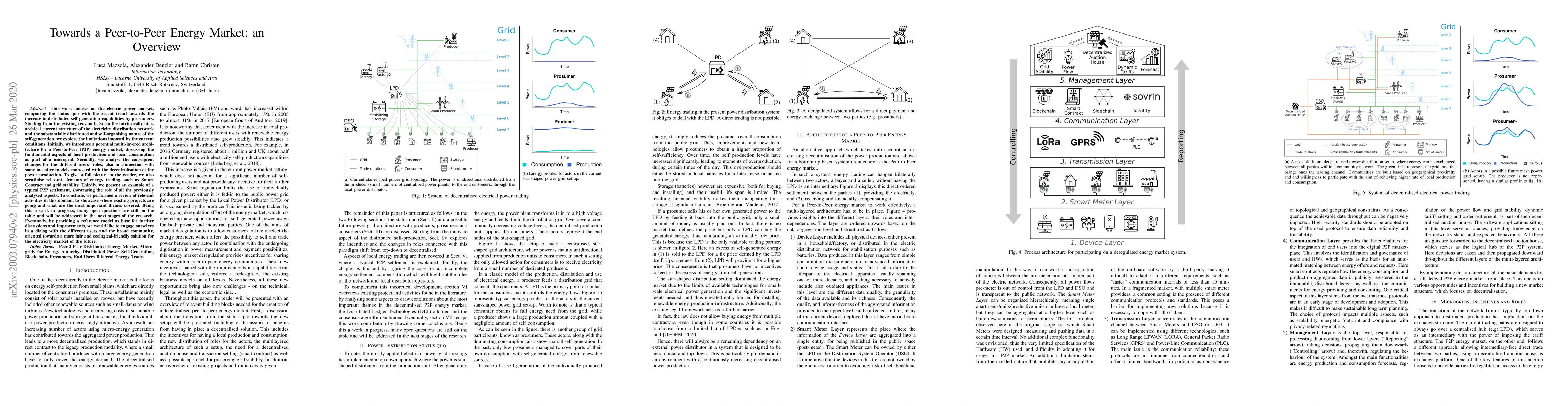 This work focuses on the electric power market, comparing the status quo with the recent trend towards the increase in distributed self-generation capabilities by prosumers. Starting from the existing tension between the intrinsically hierarchical current structure of the electricity distribution network and the substantially distributed and self-organising nature of the self-generation, we explore the limitations imposed by the current conditions. Initially, we introduce a potential multi-layered architecture for a Peer-to-Peer (P2P) energy market, discussing the fundamental aspects of local production and local consumption as part of a microgrid. Secondly, we analyse the consequent changes for the different users' roles, also in connection with some incentive models connected with the decentralisation of the power production. To give a full picture to the reader, we also scrutinise relevant elements of energy trading, such as Smart Contract and grid stability. Thirdly, we present an example of a typical P2P settlement, showcasing the role of all the previously analysed aspects. To conclude, we performed a review of relevant activities in this domain, to showcase where existing projects are going and what are the most important themes covered. Being this a work in progress, many open questions are still on the table and will be addressed in the next stages of the research. Eventually, by providing a reference model as base for further discussions and improvements, we would like to engage ourselves in a dialog with the different users and the broad community, oriented towards a more fair and ecological-friendly solution for the electricity market of the future.