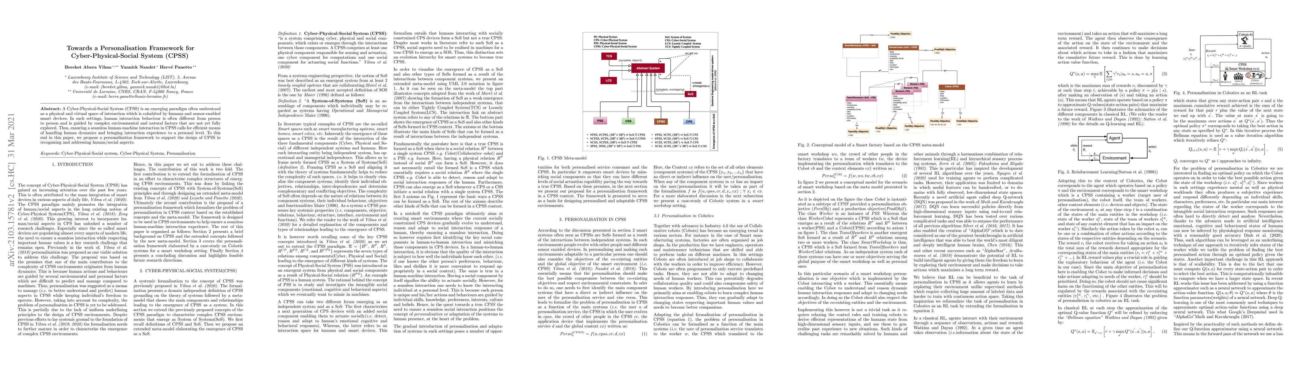 A Cyber-Physical-Social System (CPSS) is an emerging paradigm often understood as a physical and virtual space of interaction which is cohabited by humans and sensor-enabled smart devices. In such settings, human interaction behaviour is often different from person to person and is guided by complex environmental and natural factors that are not yet fully explored. Thus, ensuring a seamless human-machine interaction in CPSS calls for efficient means of handling human dynamics and bringing interaction experience to a personal level. To this end in this paper, we propose a personalisation framework to support the design of CPSS in recognising and addressing human/social aspects.