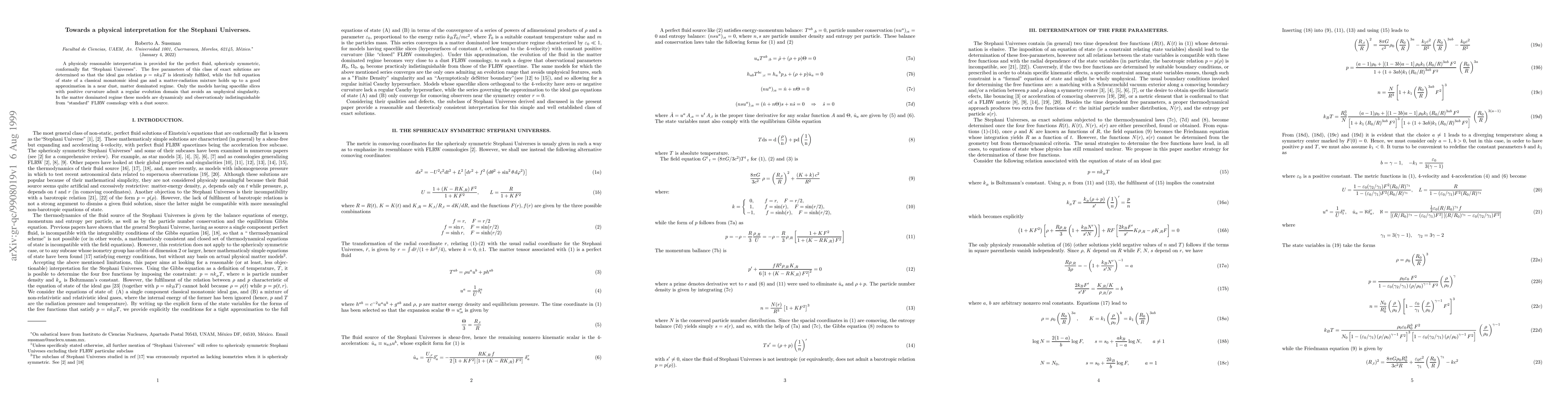 A physicaly reasonable interpretation is provided for the perfect fluid, sphericaly symmetric, conformally flat ``Stephani Universes''. The free parameters of this class of exact solutions are determined so that the ideal gas relation $p=n k T$ is identicaly fulfiled, while the full equation of state of a classical monatomic ideal gas and a matter-radiation mixture holds up to a good approximation in a near dust, matter dominated regime. Only the models having spacelike slices with positive curvature admit a regular evolution domain that avoids an unphysical singularity. In the matter dominated regime these models are dynamicaly and observationaly indistinguishable from ``standard'' FLRW cosmology with a dust source.
