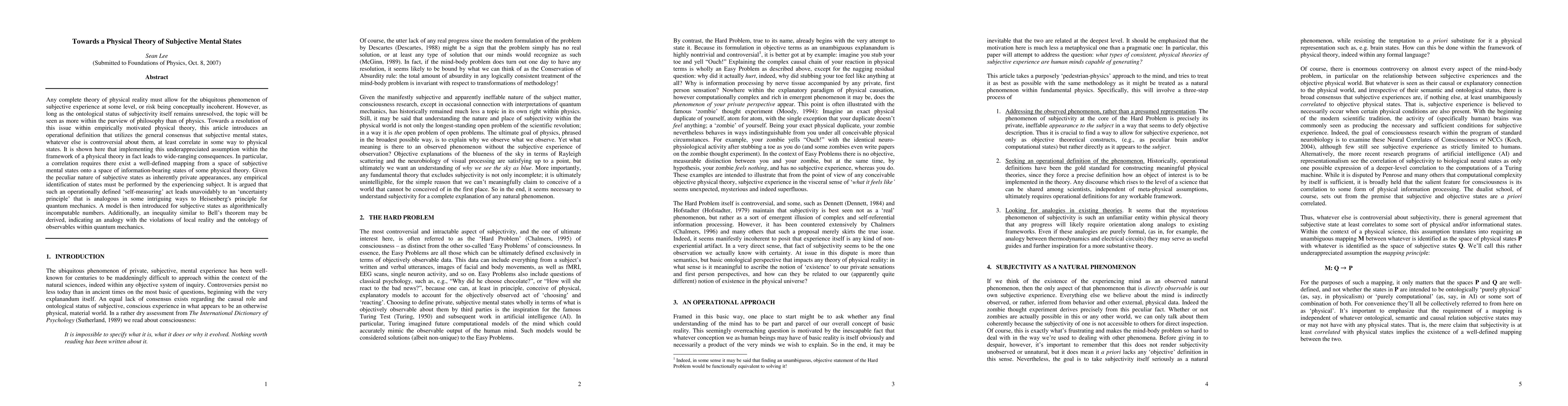 This paper proposes a physical theory framework that incorporates subjective mental states by defining a correlation between them and physical states, leading to a self-measuring 'uncertainty principle' and algorithmically incomputable numbers, akin to quantum mechanics' non-locality and ontology of observables.