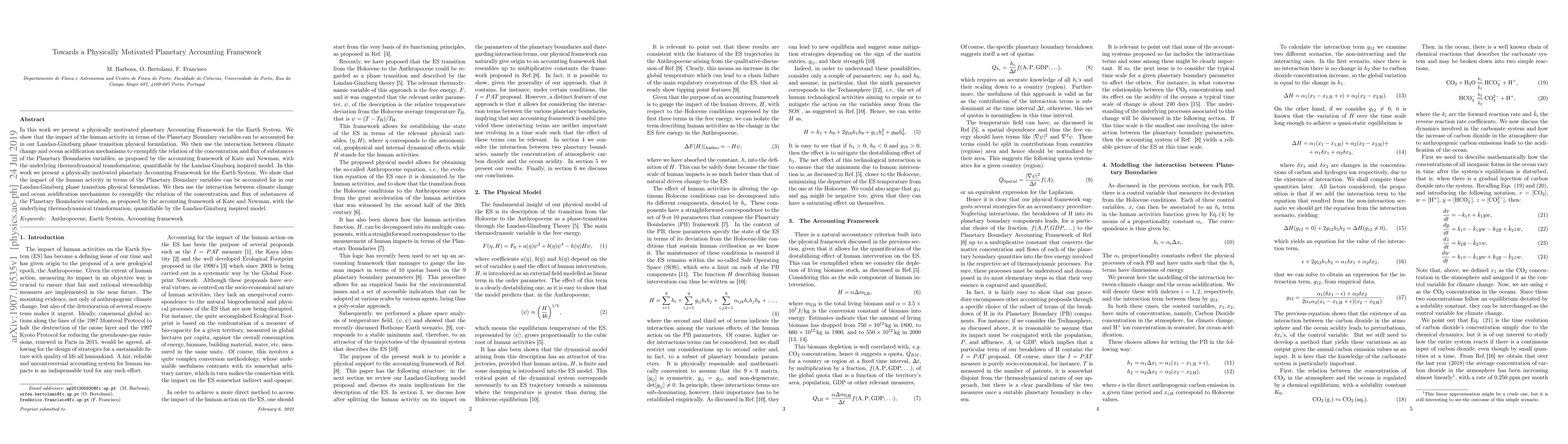 In this work we present a physically motivated planetary Accounting Framework for the Earth System. We show that the impact of the human activity in terms of the Planetary Boundary variables can be accounted for in our Landau-Ginzburg phase transition physical formulation. We then use the interaction between climate change and ocean acidification mechanisms to exemplify the relation of the concentration and flux of substances of the Planetary Boundaries variables, as proposed by the accounting framework of Kate and Newman, with the underlying thermodynamical transformation, quantifiable by the Landau-Ginzburg inspired model. In this work we present a physically motivated planetary Accounting Framework for the Earth System. We show that the impact of the human activity in terms of the Planetary Boundary variables can be accounted for in our Landau-Ginzburg phase transition physical formulation. We then use the interaction between climate change and ocean acidification mechanisms to exemplify the relation of the concentration and flux of substances of the Planetary Boundaries variables, as proposed by the accounting framework of Kate and Newman, with the underlying thermodynamical transformation, quantifiable by the Landau-Ginzburg inspired model.