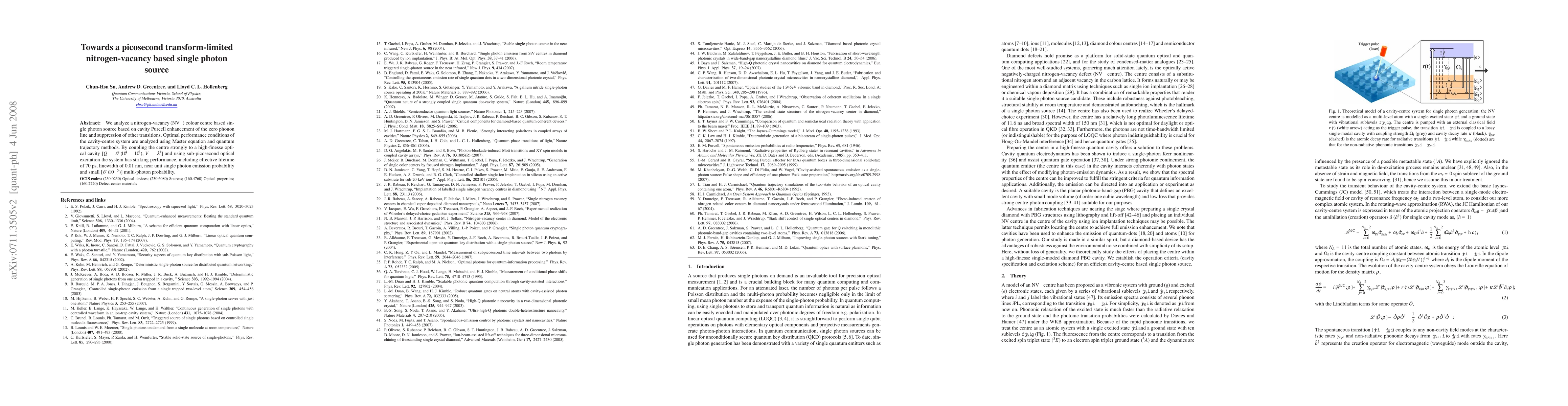 This paper investigates a nitrogen-vacancy (NV^-) centre-based single photon source enhanced by cavity Purcell effect, achieving picosecond transform-limited emission. The study employs Master equation and quantum trajectory methods to optimize the cavity-centre system, resulting in a 70 ps effective lifetime, 0.01 nm linewidth, and near-unity single photon emission probability.