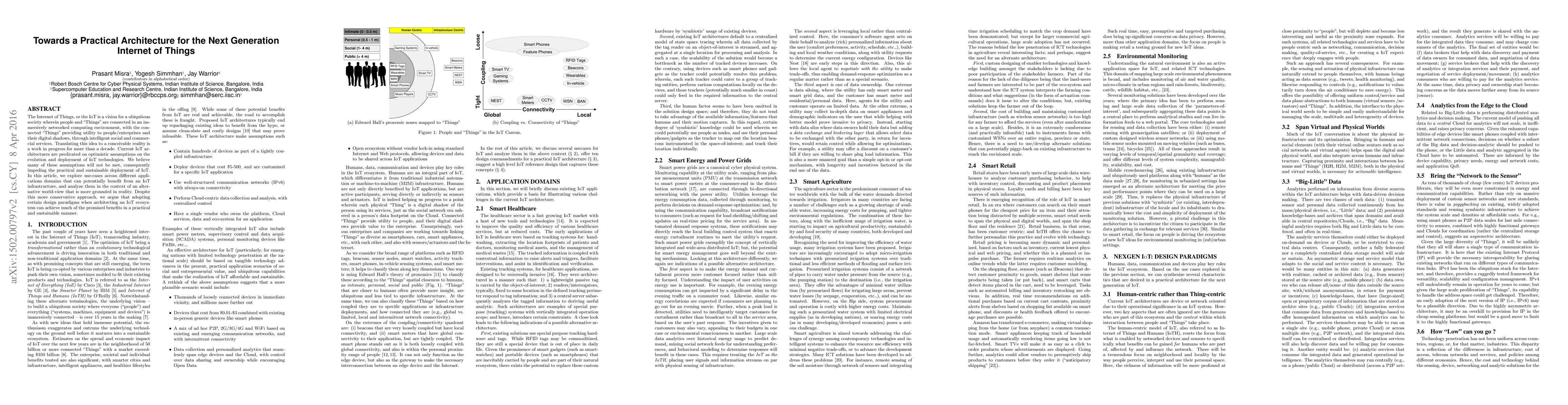 The Internet of Things, or the IoT is a vision for a ubiquitous society wherein people and "Things" are connected in an immersively networked computing environment, with the connected "Things" providing utility to people/enterprises and their digital shadows, through intelligent social and commercial services. Translating this idea to a conceivable reality is a work in progress for more than a decade. Current IoT architectures are predicated on optimistic assumptions on the evolution and deployment of IoT technologies. We believe many of these assumptions will not be met, consequently impeding the practical and sustainable deployment of IoT. In this article, we explore use-cases across different applications domains that can potentially benefit from an IoT infrastructure, and analyze them in the context of an alternative world-view that is more grounded in reality. Despite this more conservative approach, we argue that adopting certain design paradigms when architecting an IoT ecosystem can achieve much of the promised benefits in a practical and sustainable manner.