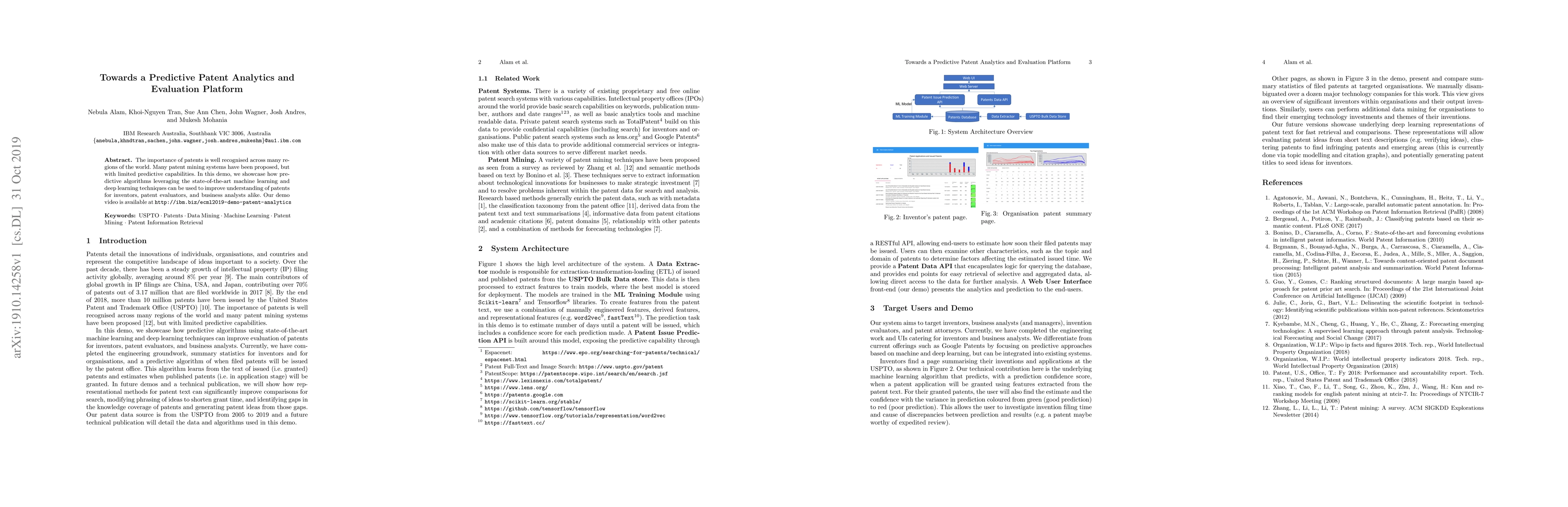 This paper presents a predictive patent analytics platform utilizing advanced machine learning and deep learning techniques to enhance the understanding of patents for inventors, evaluators, and business analysts. The demo showcases the platform's capabilities, available at http://ibm.biz/ecml2019-demo-patent-analytics.