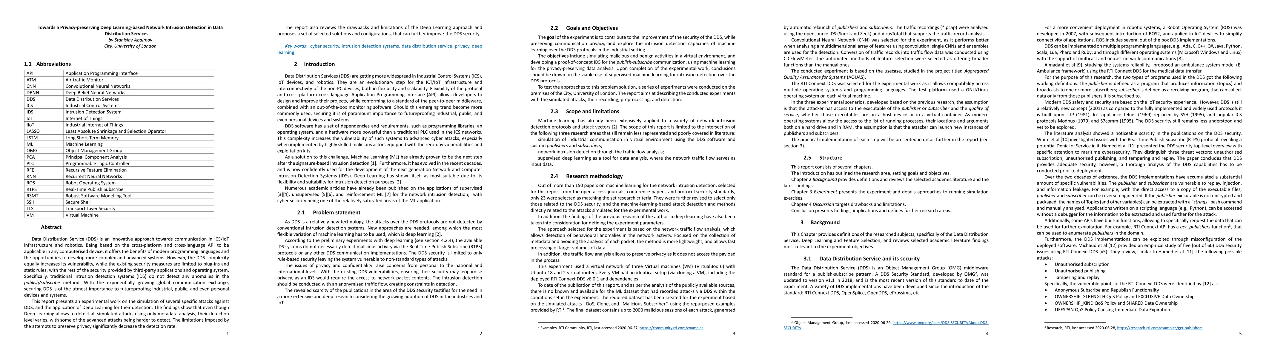 Data Distribution Service (DDS) is an innovative approach towards communication in ICS/IoT infrastructure and robotics. Being based on the cross-platform and cross-language API to be applicable in any computerised device, it offers the benefits of modern programming languages and the opportunities to develop more complex and advanced systems. However, the DDS complexity equally increases its vulnerability, while the existing security measures are limited to plug-ins and static rules, with the rest of the security provided by third-party applications and operating system. Specifically, traditional intrusion detection systems (IDS) do not detect any anomalies in the publish/subscribe method. With the exponentially growing global communication exchange, securing DDS is of the utmost importance to futureproofing industrial, public, and even personal devices and systems. This report presents an experimental work on the simulation of several specific attacks against DDS, and the application of Deep Learning for their detection. The findings show that even though Deep Learning allows to detect all simulated attacks using only metadata analysis, their detection level varies, with some of the advanced attacks being harder to detect. The limitations imposed by the attempts to preserve privacy significantly decrease the detection rate. The report also reviews the drawbacks and limitations of the Deep Learning approach and proposes a set of selected solutions and configurations, that can further improve the DDS security.