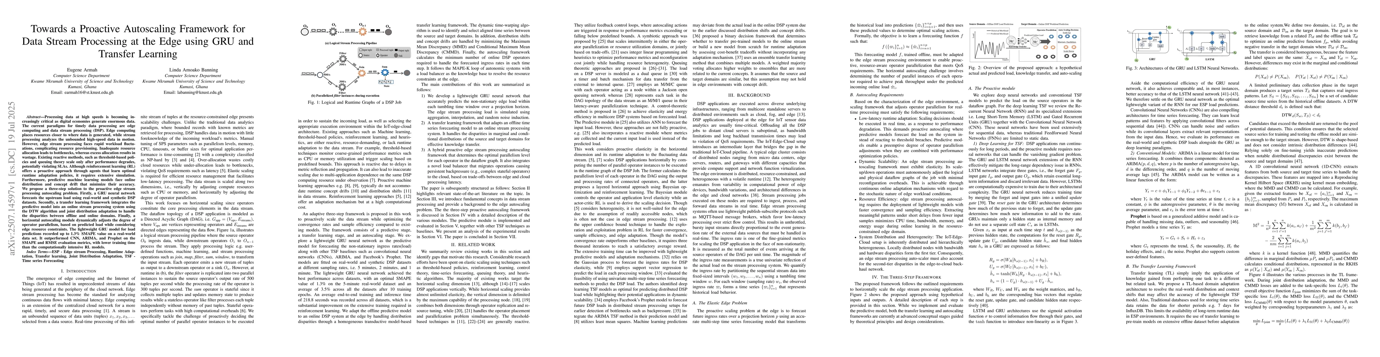 Processing data at high speeds is becoming increasingly critical as digital economies generate enormous data. The current paradigms for timely data processing are edge computing and data stream processing (DSP). Edge computing places resources closer to where data is generated, while stream processing analyzes the unbounded high-speed data in motion. However, edge stream processing faces rapid workload fluctuations, complicating resource provisioning. Inadequate resource allocation leads to bottlenecks, whereas excess allocation results in wastage. Existing reactive methods, such as threshold-based policies and queuing theory scale only after performance degrades, potentially violating SLAs. Although reinforcement learning (RL) offers a proactive approach through agents that learn optimal runtime adaptation policies, it requires extensive simulation. Furthermore, predictive machine learning models face online distribution and concept drift that minimize their accuracy. We propose a three-step solution to the proactive edge stream processing autoscaling problem. Firstly, a GRU neural network forecasts the upstream load using real-world and synthetic DSP datasets. Secondly, a transfer learning framework integrates the predictive model into an online stream processing system using the DTW algorithm and joint distribution adaptation to handle the disparities between offline and online domains. Finally, a horizontal autoscaling module dynamically adjusts the degree of operator parallelism, based on predicted load while considering edge resource constraints. The lightweight GRU model for load predictions recorded up to 1.3\% SMAPE value on a real-world data set. It outperformed CNN, ARIMA, and Prophet on the SMAPE and RMSE evaluation metrics, with lower training time than the computationally intensive RL models.