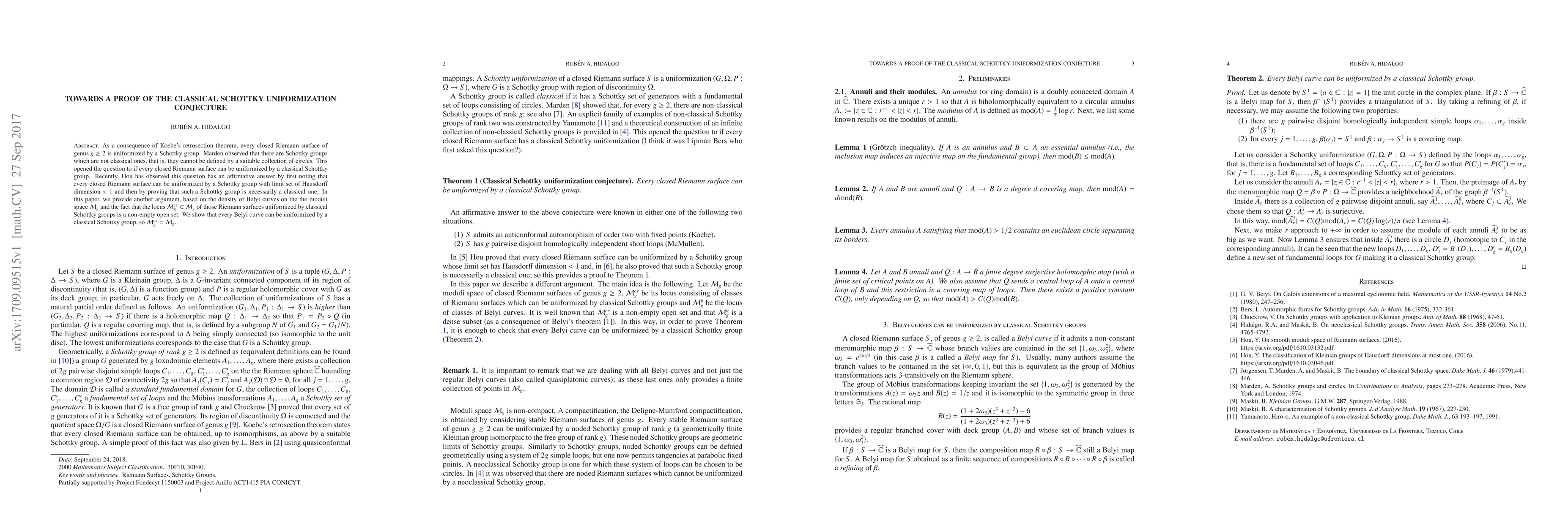 As a consequence of Koebe's retrosection theorem, every closed Riemann surface of genus $g \geq 2$ is uniformized by a Schottky group. Marden observed that there are Schottky groups which are not classical ones, that is, they cannot be defined by a suitable collection of circles. This opened the question to if every closed Riemann surface can be uniformized by a classical Schottky group. Recently, Hou has observed this question has an affirmative answer by first noting that every closed Riemann surface can be uniformized by a Schottky group with limit set of Hausdorff dimension $<1$ and then by proving that such a Schottky group is necessarily a classical one. In this paper, we provide another argument, based on the density of Belyi curves on the the moduli space ${\mathcal M}_{g}$ and the fact that the locus ${\mathcal M}_{g}^{cs} \subset {\mathcal M}_{g}$ of those Riemann surfaces uniformized by classical Schottky groups is a non-empty open set. We show that every Belyi curve can be uniformized by a classical Schottky group, so ${\mathcal M}_{g}^{cs}={\mathcal M}_{g}$.
