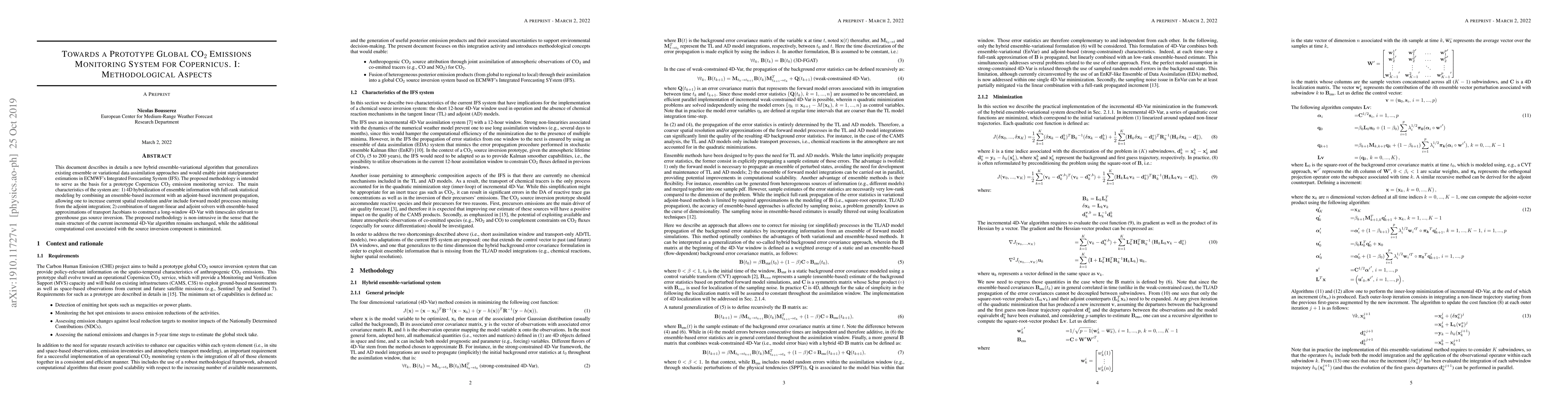 This document describes in detail a new hybrid ensemble-variational algorithm that generalizes existing ensemble or variational data assimilation approaches and would enable joint state/parameter estimations in ECMWF's Integrated Forecasting System (IFS). The proposed methodology is intended to serve as the basis for a prototype Copernicus CO2 emission monitoring service. The main characteristics of the system are: 1) 4D hybridization of ensemble information with full-rank statistical modeling by combining an ensemble-based increment with an adjoint-based increment propagation, allowing one to increase current spatial resolution and/or include forward model processes missing from the adjoint integration; 2) combination of tangent-linear and adjoint solvers with ensemble-based approximations of transport Jacobians to construct a long-window 4D-Var with timescales relevant to greenhouse gas source inversion. The proposed methodology is non-intrusive in the sense that the main structure of the current incremental 4D-Var algorithm remains unchanged, while the additional computational cost associated with the source inversion component is minimized.