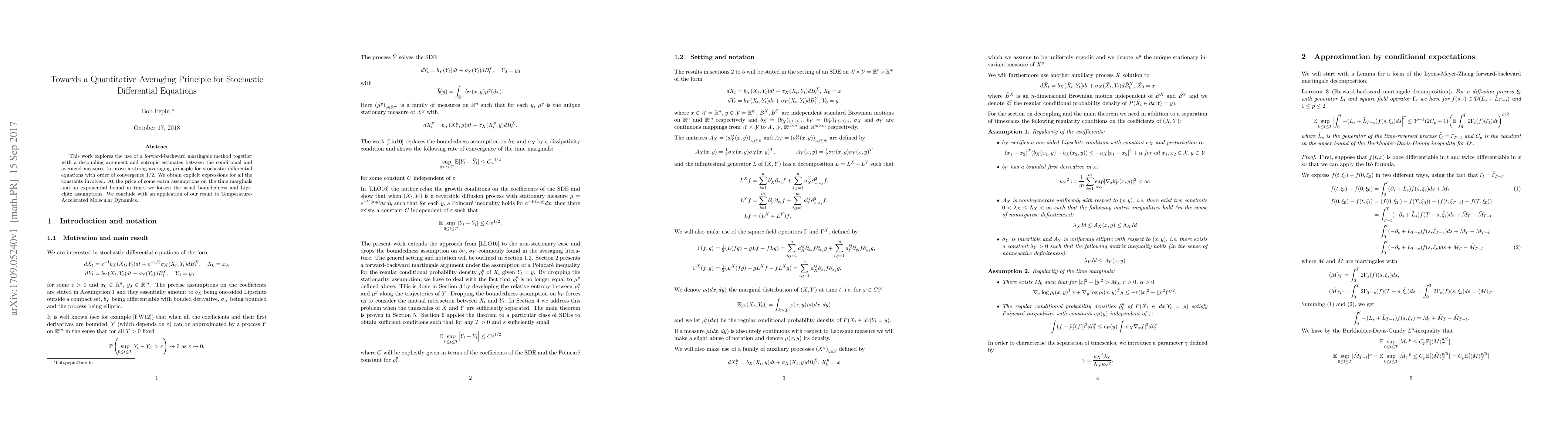 This work explores the use of a forward-backward martingale method together with a decoupling argument and entropic estimates between the conditional and averaged measures to prove a strong averaging principle for stochastic differential equations with order of convergence 1/2. We obtain explicit expressions for all the constants involved. At the price of some extra assumptions on the time marginals and an exponential bound in time, we loosen the usual boundedness and Lipschitz assumptions. We conclude with an application of our result to Temperature-Accelerated Molecular Dynamics.