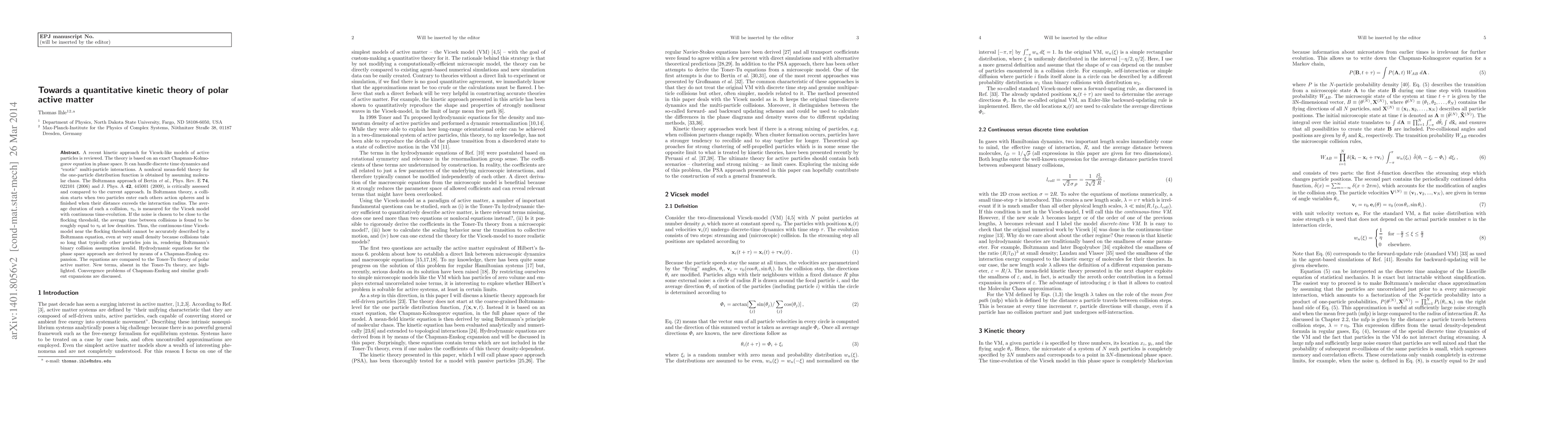 This paper reviews a kinetic approach for Vicsek-like models of active particles, showing that the continuous-time Vicsek model near the flocking threshold cannot be accurately described by Boltzmann's binary collision assumption due to prolonged interactions. New hydrodynamic equations are derived and compared to Toner-Tu theory, highlighting additional terms and discussing convergence issues.