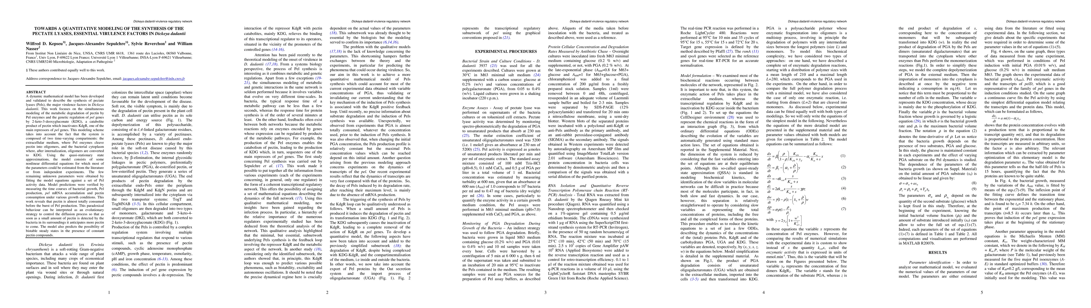 A dynamic mathematical model has been developed and validated to describe the synthesis of pectate lyases (Pels), the major virulence factors in Dickeya dadantii. This work focuses on the simultaneous modeling of the metabolic degradation of pectin by Pel enzymes and the genetic regulation of pel genes by 2-keto-3-deoxygluconate (KDG), a catabolite product of pectin which inactivates KdgR, one of the main repressors of pel genes. This modeling scheme takes into account the fact that the system is composed of two time-varying compartments: the extracellular medium, where Pel enzymes cleave pectin into oligomers, and the bacterial cytoplasm where, after internalization, oligomers are converted to KDG. Using the quasi-stationary state approximations, the model consists of some nonlinear differential equations for which most of the parameters could be estimated from the literature or from independent experiments. The few remaining unknown parameters were obtained by fitting the model equations against a set of Pel activity data. Model predictions were verified by measuring the time courses of bacterial growth, Pel production, pel mRNA accumulation and pectin consumption under various growth conditions. This work reveals that pectin is almost totally consumed before the burst of Pel production. This paradoxical behaviour can be interpreted as an evolutionary strategy to control the diffusion process so that as soon as a small amount of pectin is detected by the bacteria in its surroundings it anticipates more pectin to come. The model also predicts the possibility of bistable steady states in the presence of constant pectin compounds.