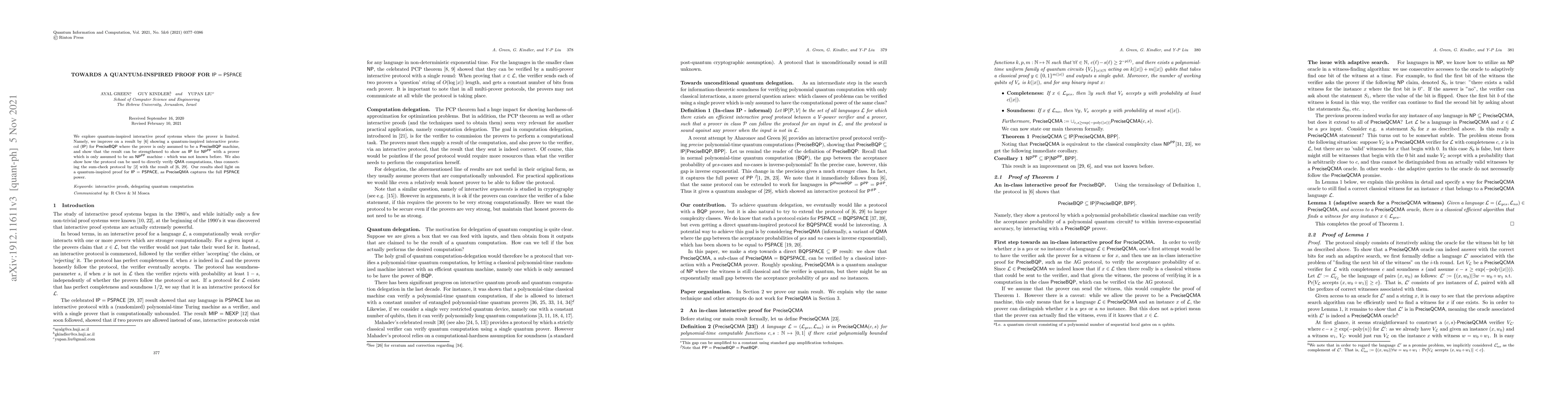 We explore quantum-inspired interactive proof systems where the prover is limited. Namely, we improve on a result by [AG17] showing a quantum-inspired interactive protocol ($\sf IP$) for $\sf PreciseBQP$ where the prover is only assumed to be a $\sf PreciseBQP$ machine, and show that the result can be strengthened to show an $\sf IP$ for $\sf NP^{PP}$ with a prover which is only assumed to be an $\sf NP^{PP}$ machine - which was not known before. We also show how the protocol can be used to directly verify $\sf QMA$ computations, thus connecting the sum-check protocol by [AAV13] with the result of [AG17, LFKN90]. Our results shed light on a quantum-inspired proof for ${\sf IP} = {\sf PSPACE}$, as $\sf PreciseQMA$ captures the full $\sf PSPACE$ power.