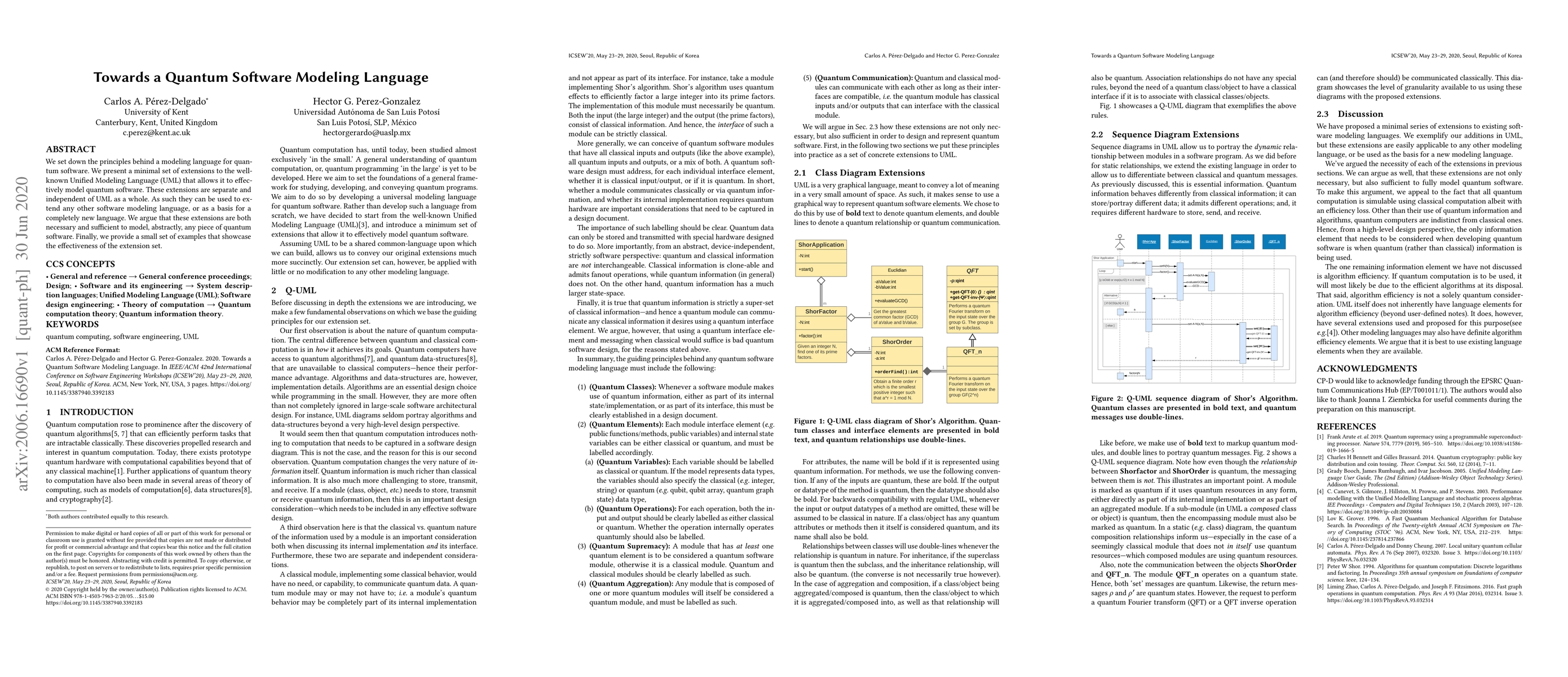 This paper proposes a set of extensions to the Unified Modeling Language (UML) to model quantum software, arguing that these extensions are both necessary and sufficient for abstractly representing any quantum software. It demonstrates the effectiveness of these extensions through a few examples.