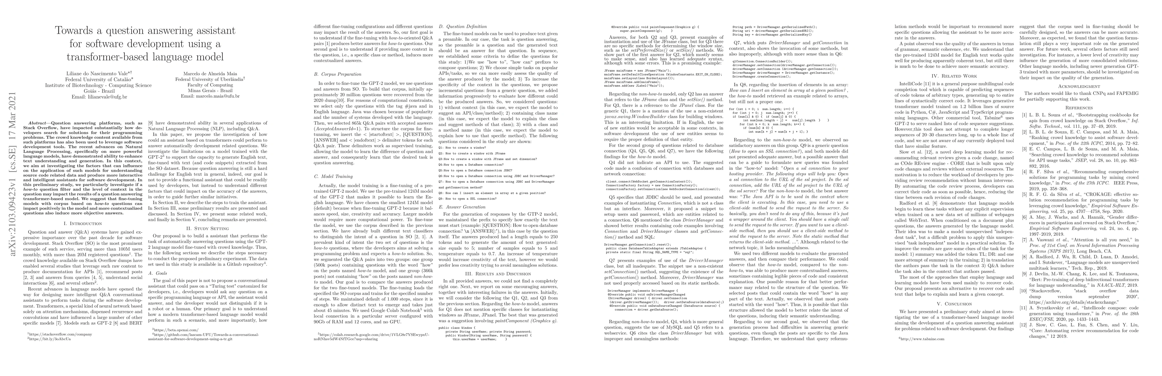 A study investigates using transformer-based language models to create question answering assistants for software development, finding that fine-tuning with how-to questions and more contextualized queries lead to better results.