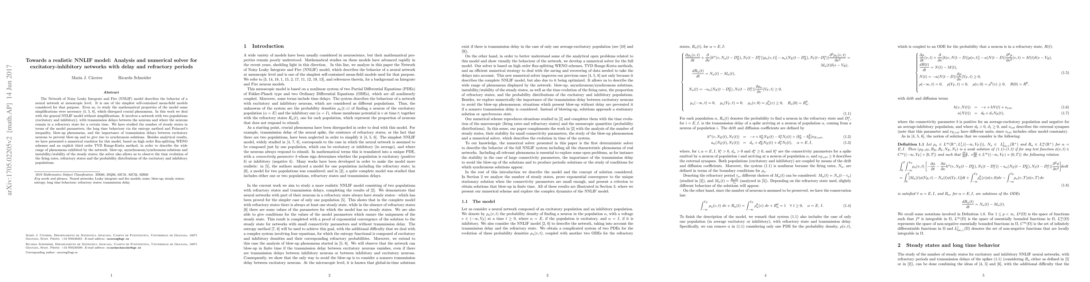 This paper develops a comprehensive NNLIF model for excitatory-inhibitory neural networks, incorporating delays and refractory periods. It analyzes steady states, long-term behavior, and the impact of delays on blow-up prevention and synchronization, alongside a numerical solver based on WENO schemes and Runge-Kutta methods to simulate the network's dynamics.