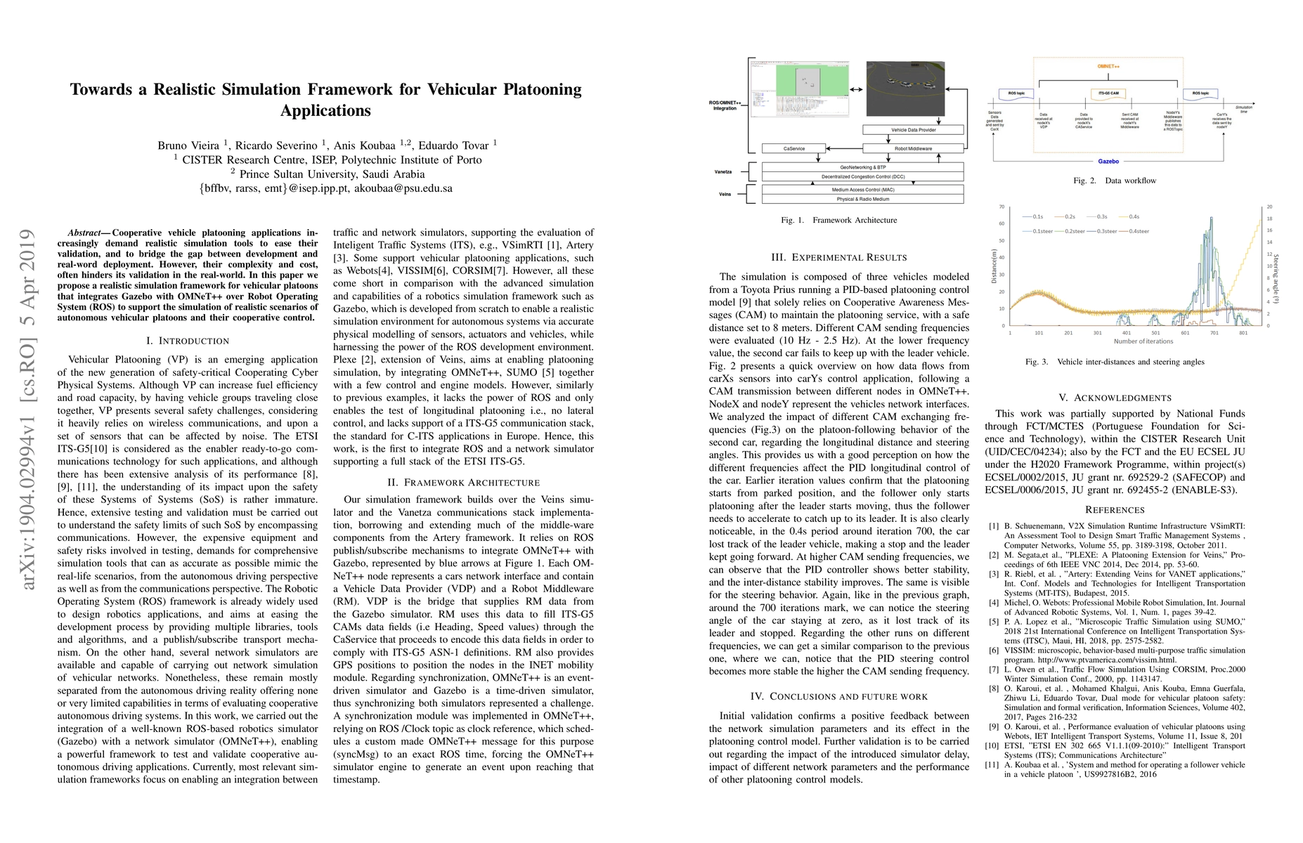 This paper proposes a realistic simulation framework integrating Gazebo, OMNeT++, and ROS to simulate autonomous vehicular platoons and their cooperative control, aiming to bridge the gap between development and real-world deployment of cooperative vehicle platooning applications. The framework seeks to reduce the complexity and cost associated with real-world validation.