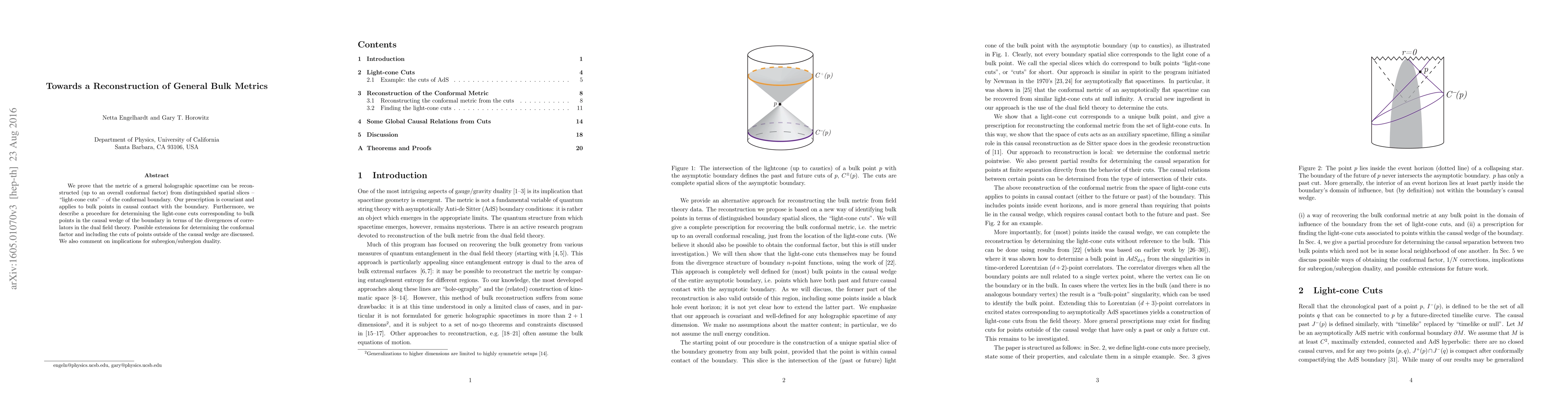 We prove that the metric of a general holographic spacetime can be reconstructed (up to an overall conformal factor) from distinguished spatial slices - "light-cone cuts" - of the conformal boundary. Our prescription is covariant and applies to bulk points in causal contact with the boundary. Furthermore, we describe a procedure for determining the light-cone cuts corresponding to bulk points in the causal wedge of the boundary in terms of the divergences of correlators in the dual field theory. Possible extensions for determining the conformal factor and including the cuts of points outside of the causal wedge are discussed. We also comment on implications for subregion/subregion duality.