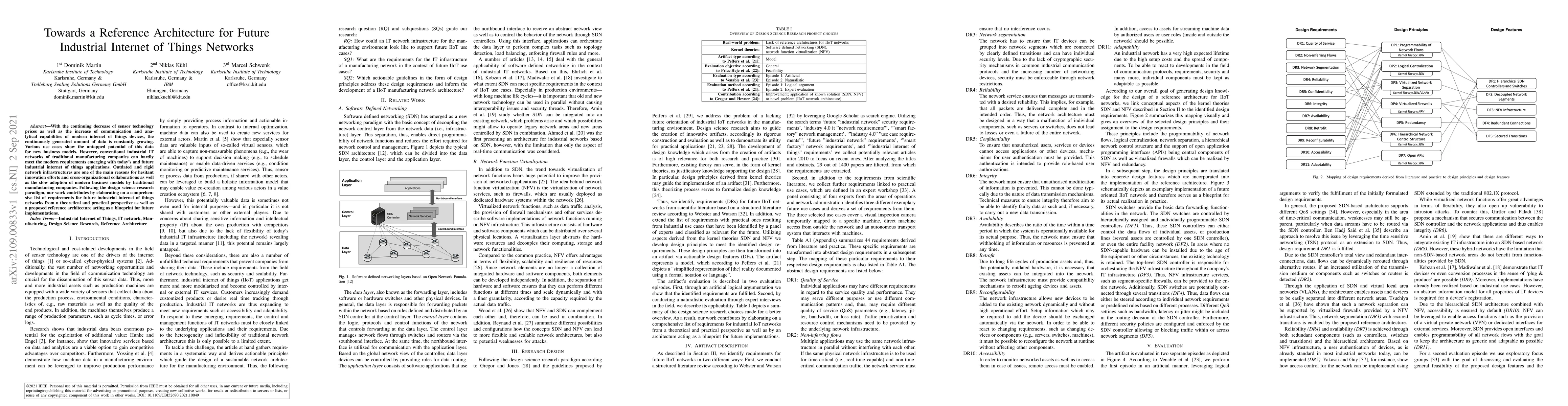 This paper proposes a reference architecture for future industrial Internet of Things (IoT) networks, addressing the limitations of current industrial IT infrastructures. It outlines requirements and provides a blueprint to facilitate innovation and collaboration in traditional manufacturing companies.