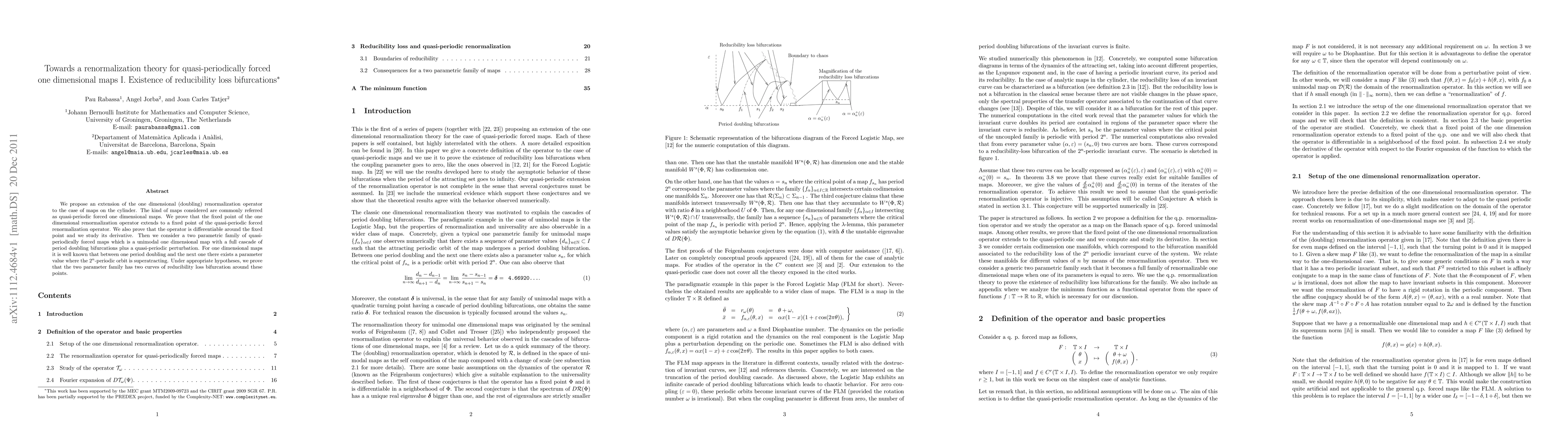 This paper extends the renormalization operator to quasi-periodically forced one-dimensional maps, proving the existence of fixed points and differentiability. It also identifies two curves of reducibility loss bifurcations in a two-parametric family of these maps, demonstrating complex dynamical behavior.