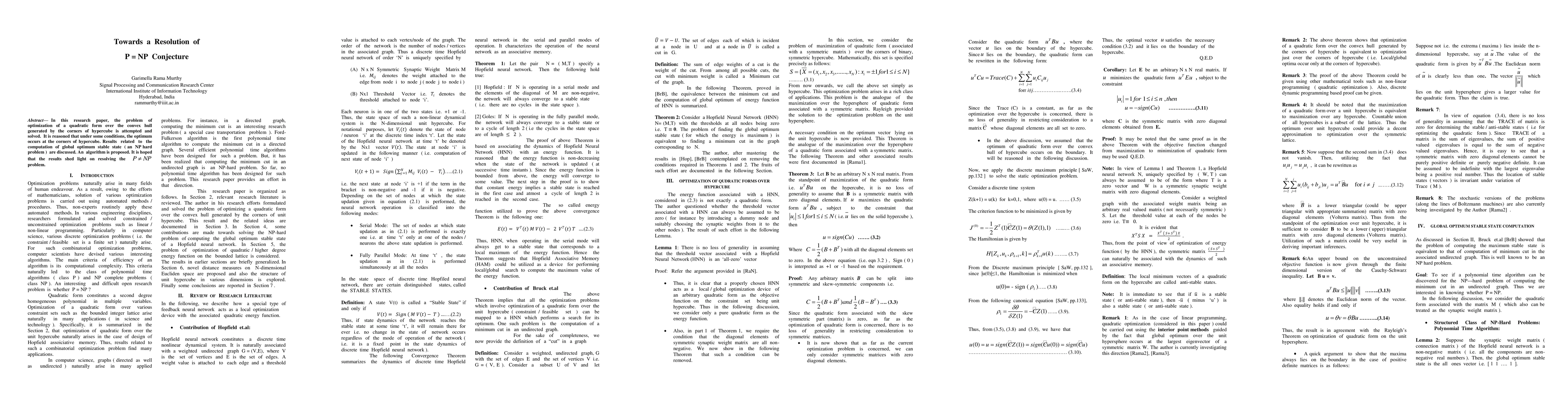 In this research paper, the problem of optimization of a quadratic form over the convex hull generated by the corners of hypercube is attempted and solved. It is reasoned that under some conditions, the optimum occurs at the corners of hypercube. Results related to the computation of global optimum stable state (an NP hard problem) are discussed. An algorithm is proposed. It is hoped that the results shed light on resolving the P not equal to NP problem.