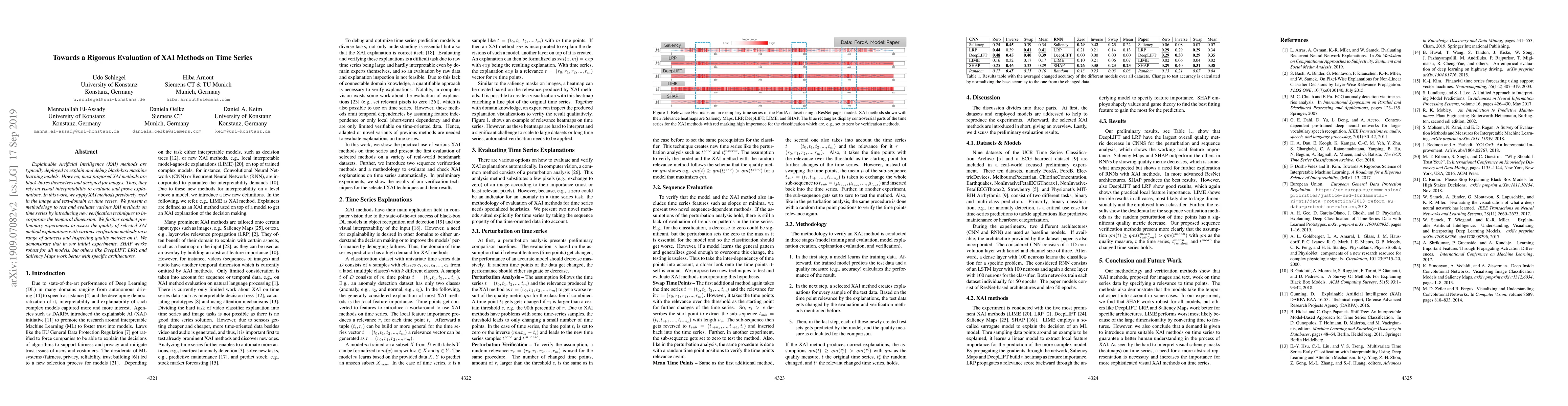 Explainable Artificial Intelligence (XAI) methods are typically deployed to explain and debug black-box machine learning models. However, most proposed XAI methods are black-boxes themselves and designed for images. Thus, they rely on visual interpretability to evaluate and prove explanations. In this work, we apply XAI methods previously used in the image and text-domain on time series. We present a methodology to test and evaluate various XAI methods on time series by introducing new verification techniques to incorporate the temporal dimension. We further conduct preliminary experiments to assess the quality of selected XAI method explanations with various verification methods on a range of datasets and inspecting quality metrics on it. We demonstrate that in our initial experiments, SHAP works robust for all models, but others like DeepLIFT, LRP, and Saliency Maps work better with specific architectures.