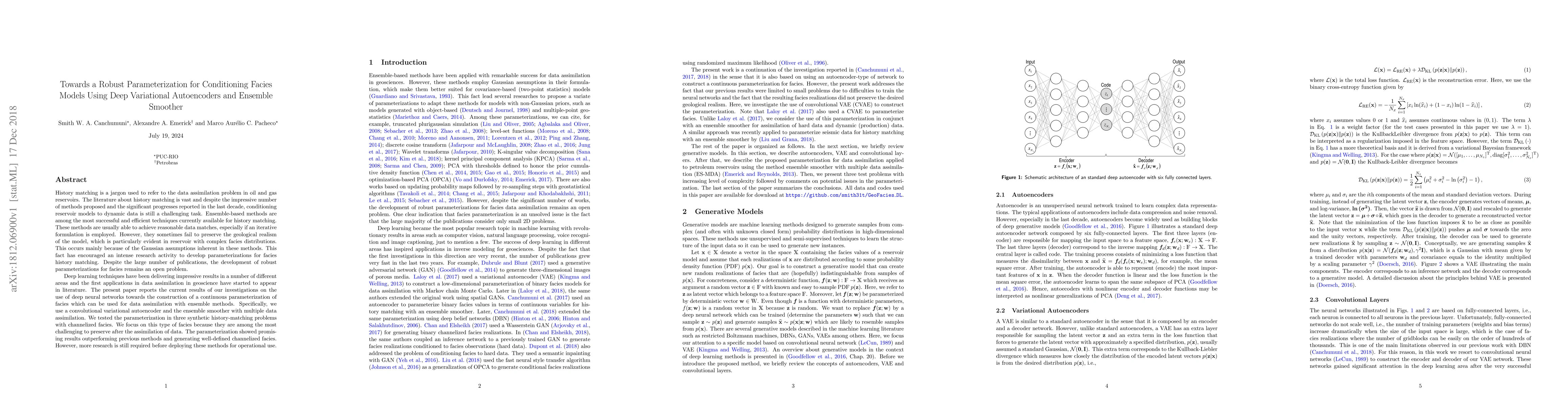 This paper explores the use of deep variational autoencoders and ensemble smoothers to develop a robust parameterization for conditioning facies models in reservoir history matching. The proposed method, tested on synthetic data with channelized facies, demonstrates promising results in preserving geological realism compared to traditional Gaussian-based ensemble methods.