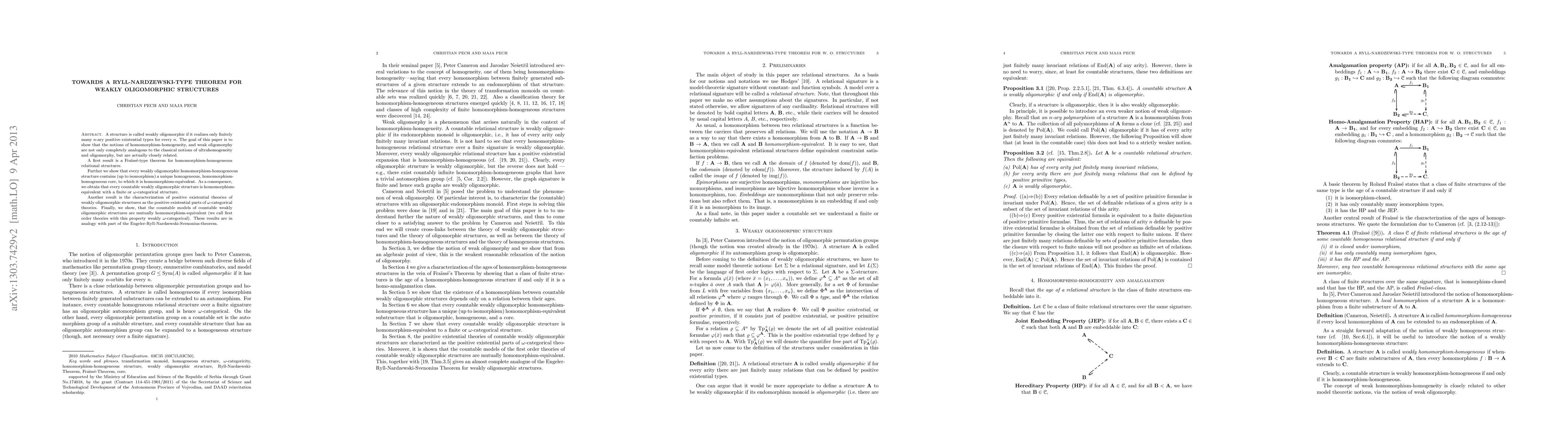 A structure is called weakly oligomorphic if it realizes only finitely many n-ary positive existential types for every n. The goal of this paper is to show that the notions of homomorphism-homogeneity, and weak oligomorphy are not only completely analogous to the classical notions of ultrahomogeneity and oligomorphy, but are actually closely related. A first result is a Fra\"iss\'e-type theorem for homomorphism-homogeneous relational structures. Further we show that every weakly oligomorphic homomorphism-homogeneous structure contains (up to isomorphism) a unique homogeneous, homomorphism-homogeneous core, to which it is homomorphism-equivalent. As a consequence, we obtain that every countable weakly oligomorphic structure is homomorphism-equivalent with a finite or \omega-categorical structure. Another result is the characterization of positive existential theories of weakly oligomorphic structures as the positive existential parts of \omega-categorical theories. Finally, we show, that the countable models of countable weakly oligomorphic structures are mutually homomorphism-equivalent (we call first order theories with this property weakly \omega-categorical). These results are in analogy with part of the Engeler-Ryll-Nardzewski-Svenonius-theorem.