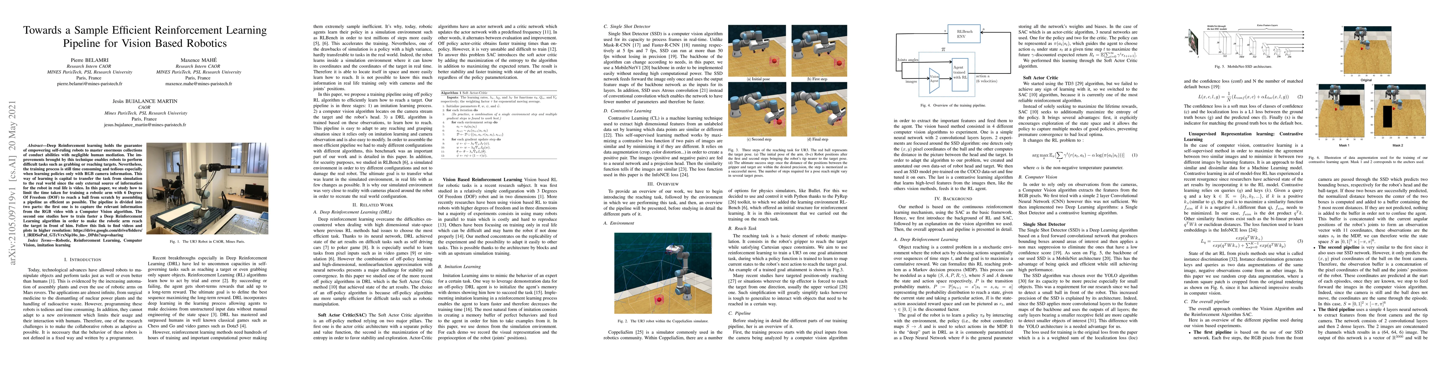 This paper proposes a sample-efficient reinforcement learning pipeline to train a robotic arm to reach a target using RGB camera data, focusing on reducing training time. It combines computer vision for data extraction and advanced reinforcement learning techniques to expedite the learning process.