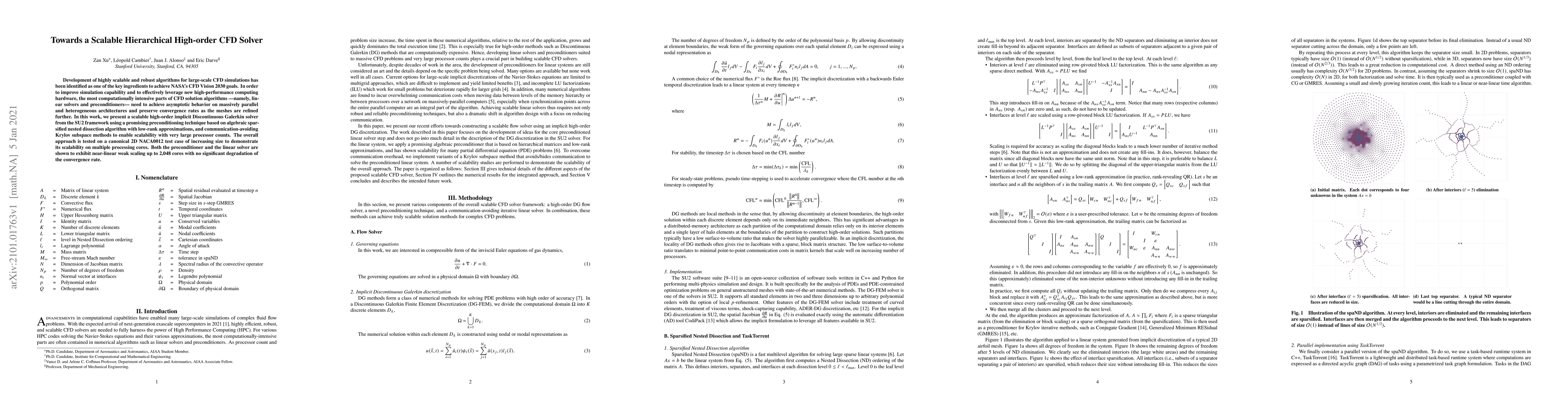 This paper develops a scalable high-order CFD solver within the SU2 framework, employing advanced preconditioning techniques and communication-avoiding methods to achieve near-linear scalability on up to 2,048 cores, demonstrating robust performance on a 2D NACA0012 test case. The approach maintains convergence rates as the mesh is refined, supporting NASA's CFD Vision 2030 goals.