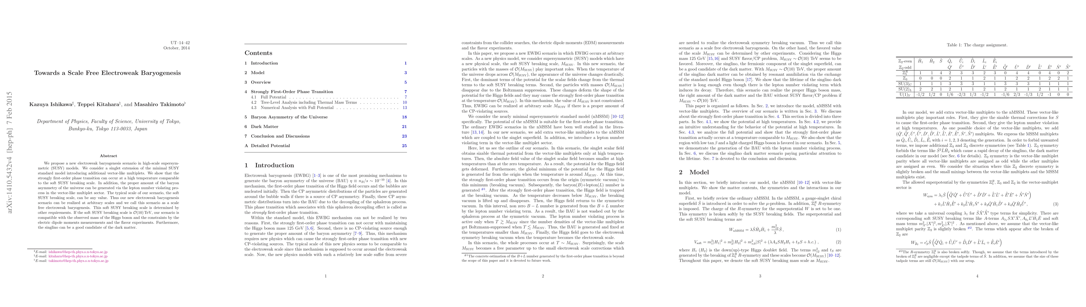 This paper proposes a novel electroweak baryogenesis scenario in high-scale supersymmetric models, introducing vector-like multiplets to generate the baryon asymmetry via lepton number violating processes. The scenario is termed "scale free" as it can occur at any soft SUSY breaking scale, compatible with observed Higgs mass and other constraints if the scale is around O(10) TeV, and the singlino is a viable dark matter candidate.