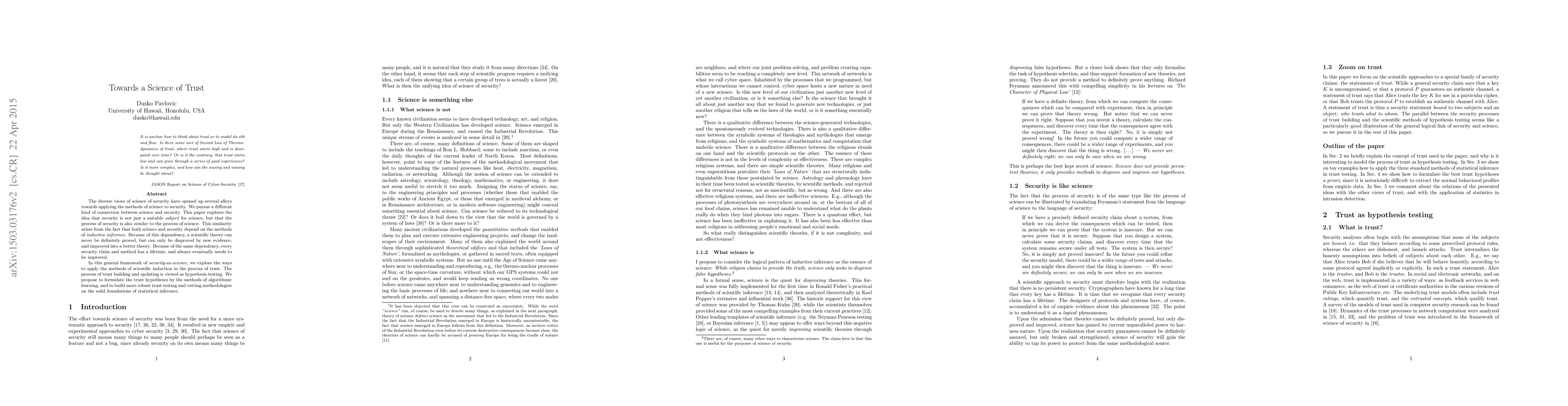 This paper explores the analogy between science and security, suggesting that security processes resemble scientific methods, particularly in their reliance on inductive inference. It proposes applying scientific induction techniques to trust building, framing trust as hypothesis testing and advocating for robust trust evaluation through algorithmic learning and statistical inference.