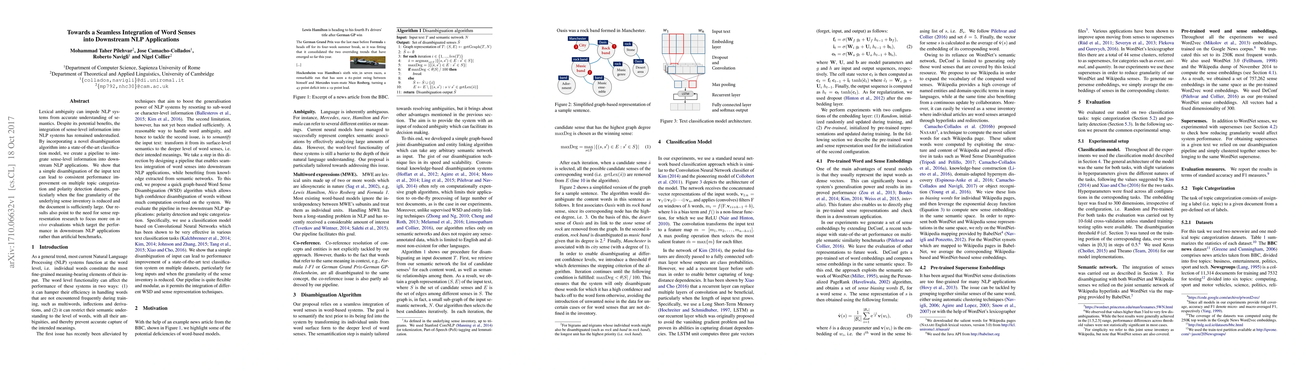 The paper proposes a pipeline for integrating sense-level knowledge into a state-of-the-art text classifier using a novel disambiguation algorithm. It evaluates the model on topic categorization and polarity detection tasks, comparing word, sense, and supersense representations.