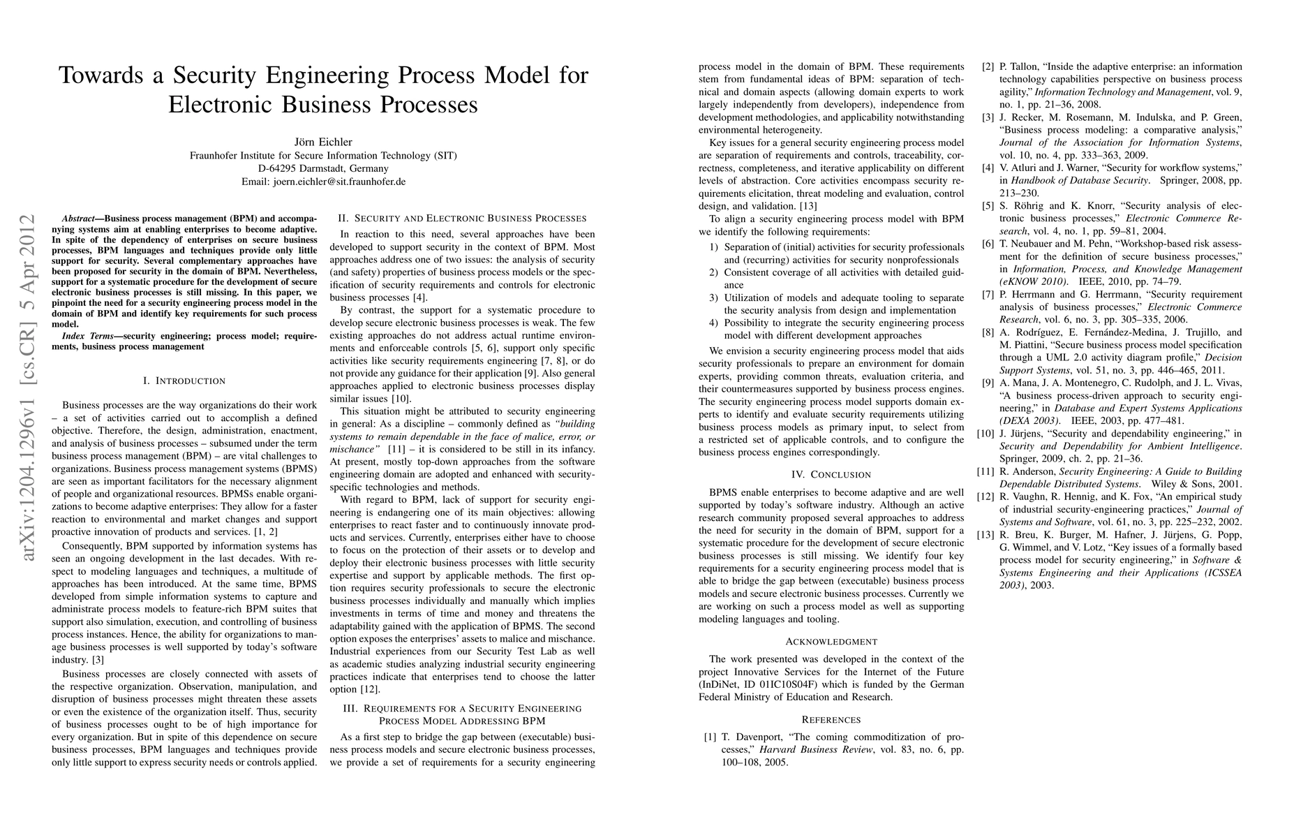 This paper highlights the lack of systematic security support in business process management (BPM) and proposes the need for a dedicated security engineering process model to enhance the development of secure electronic business processes. It identifies key requirements for such a model to address this gap.