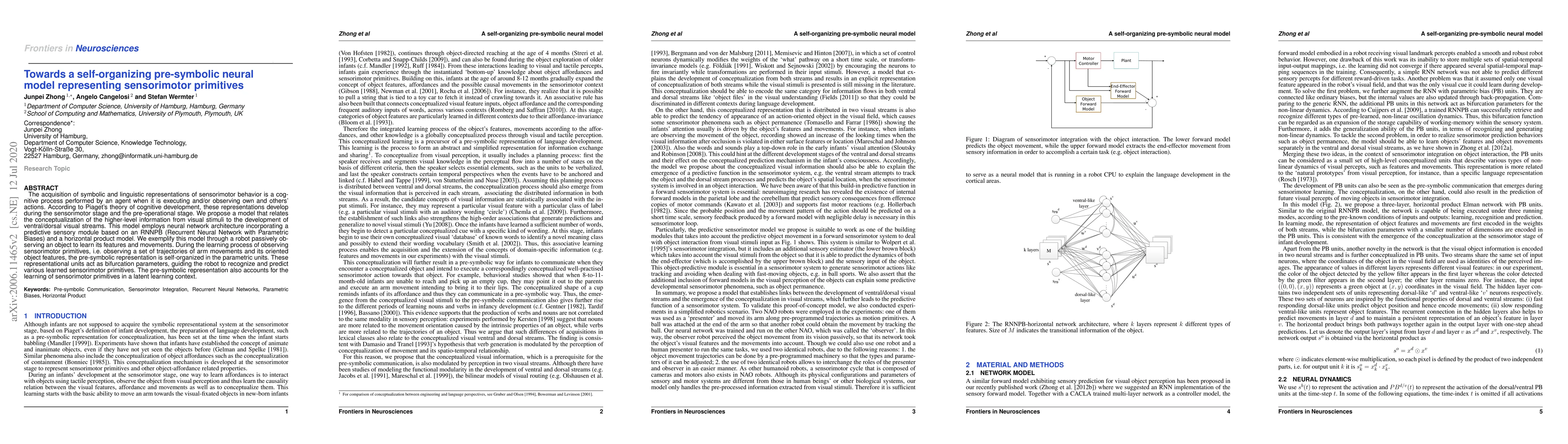 The acquisition of symbolic and linguistic representations of sensorimotor behavior is a cognitive process performed by an agent when it is executing and/or observing own and others' actions. According to Piaget's theory of cognitive development, these representations develop during the sensorimotor stage and the pre-operational stage. We propose a model that relates the conceptualization of the higher-level information from visual stimuli to the development of ventral/dorsal visual streams. This model employs neural network architecture incorporating a predictive sensory module based on an RNNPB (Recurrent Neural Network with Parametric Biases) and a horizontal product model. We exemplify this model through a robot passively observing an object to learn its features and movements. During the learning process of observing sensorimotor primitives, i.e. observing a set of trajectories of arm movements and its oriented object features, the pre-symbolic representation is self-organized in the parametric units. These representational units act as bifurcation parameters, guiding the robot to recognize and predict various learned sensorimotor primitives. The pre-symbolic representation also accounts for the learning of sensorimotor primitives in a latent learning context.