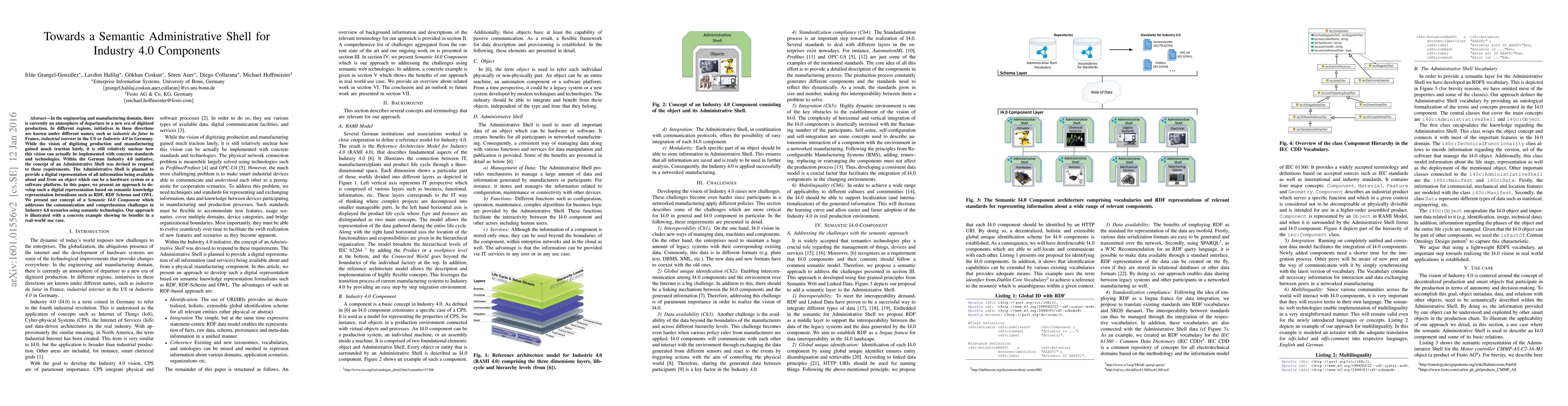 In the engineering and manufacturing domain, there is currently an atmosphere of departure to a new era of digitized production. In different regions, initiatives in these directions are known under different names, such as industrie du futur in France, industrial internet in the US or Industrie 4.0 in Germany. While the vision of digitizing production and manufacturing gained much traction lately, it is still relatively unclear how this vision can actually be implemented with concrete standards and technologies. Within the German Industry 4.0 initiative, the concept of an Administrative Shell was devised to respond to these requirements. The Administrative Shell is planned to provide a digital representation of all information being available about and from an object which can be a hardware system or a software platform. In this paper, we present an approach to developing such a digital representation based on semantic knowledge representation formalisms such as RDF, RDF Schema and OWL. We present our concept of a Semantic I4.0 Component which addresses the communication and comprehension challenges in Industry 4.0 scenarios using semantic technologies. Our approach is illustrated with a concrete example showing its benefits in a real-world use case.