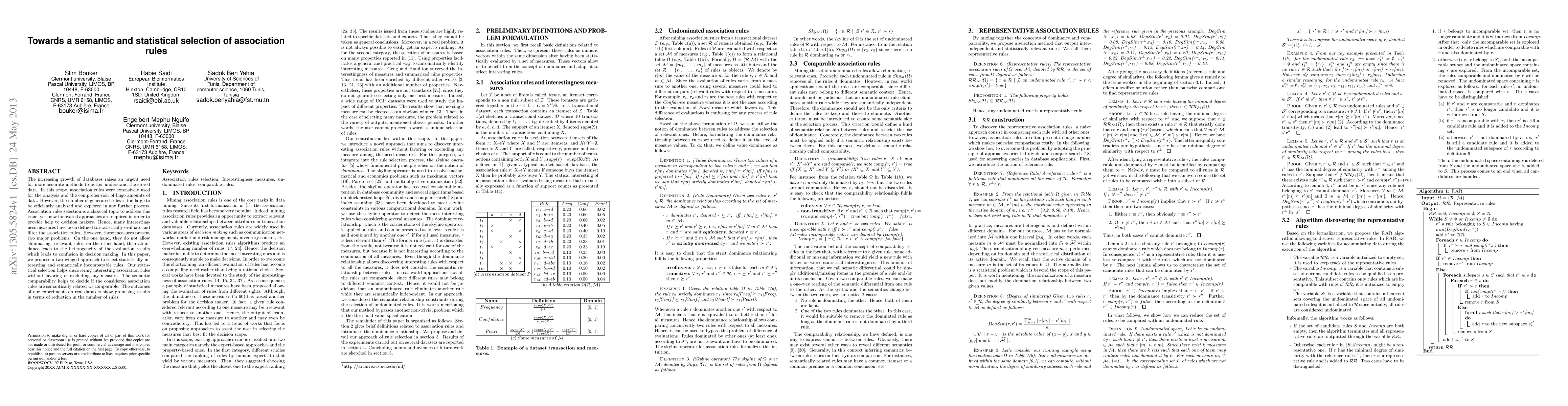 The increasing growth of databases raises an urgent need for more accurate methods to better understand the stored data. In this scope, association rules were extensively used for the analysis and the comprehension of huge amounts of data. However, the number of generated rules is too large to be efficiently analyzed and explored in any further process. Association rules selection is a classical topic to address this issue, yet, new innovated approaches are required in order to provide help to decision makers. Hence, many interesting- ness measures have been defined to statistically evaluate and filter the association rules. However, these measures present two major problems. On the one hand, they do not allow eliminating irrelevant rules, on the other hand, their abun- dance leads to the heterogeneity of the evaluation results which leads to confusion in decision making. In this paper, we propose a two-winged approach to select statistically in- teresting and semantically incomparable rules. Our statis- tical selection helps discovering interesting association rules without favoring or excluding any measure. The semantic comparability helps to decide if the considered association rules are semantically related i.e comparable. The outcomes of our experiments on real datasets show promising results in terms of reduction in the number of rules.
